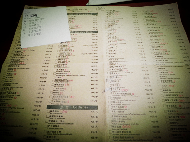但是一大缺点是点菜基本靠猜,就这么一张单子,连菜色都看不到,凭想像乱点,多次抗议,服务员说他这儿就这样,没菜谱。于是花了近二十分钟,才点了一个手抓抓合菜(这个菜你能想像得出长什么样吗)、一个西兰花、一个小混沌、一杯花生冰沙、还有什么基本没记住。除了赠送的面包诱惑、西兰花、花生冰沙味道不错,其它的菜真的是不好吃,一盘猪腰基本没动,臭臭的。
