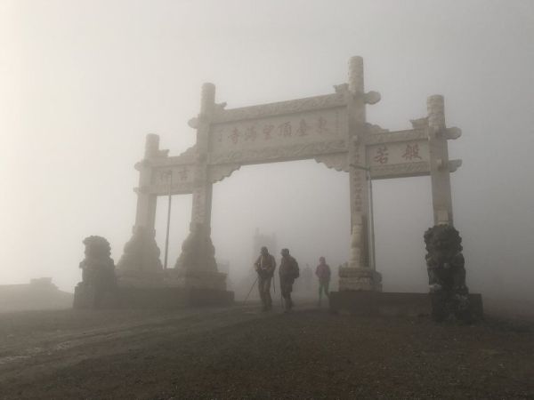 上车前因为下雨和时间赶没有集合,下车站台集合,清点人数后就出站。可能是阴天的原因,下车前就把厚衣服穿上了,我是上身软壳下身速干裤,这样的穿着走了一天,路上几个台上还都很冷!五台山火车站出站口有很多直达台怀镇的班车,走朝台的直接去坐就行,鸿门岩下车也是每人25元,我们22人,师傅直接让我们上了个小点的班车,没在等人,直接出发了,大概50分钟到达鸿门岩,一路大雾,悠悠哉哉到达鸿门岩。下车第一感觉除了冷还是冷,大雾天,能见度很低。集合说下行程,调下手台,说下哪里住农家院就开启放羊模式了,这里也是一路上唯一一次人齐。东台很简单,鸿门岩海拔2500米,台顶望海寺,海拔2796米,距离1.8KM,上升200多米,一般半小时就能上去,上去后正好有斋饭,小伙伴们就进去吃了斋饭,馒头咸菜粥。吃斋饭记得捐功德,一般是十块钱,随意的。