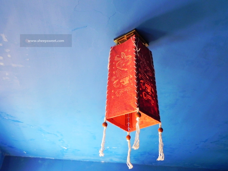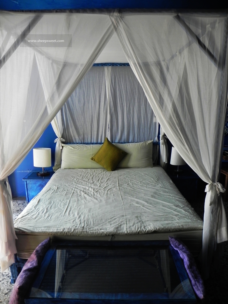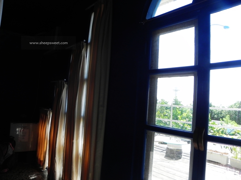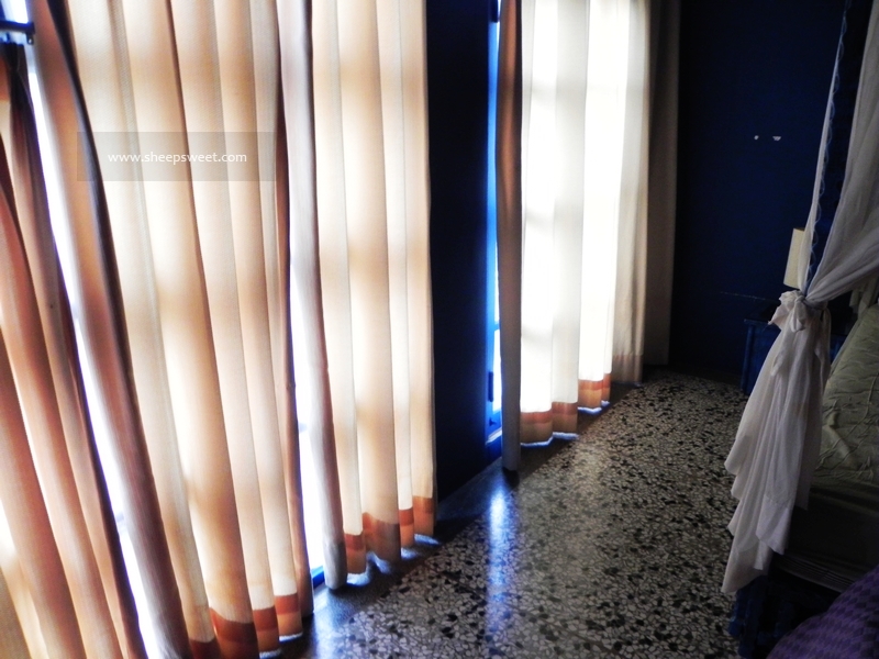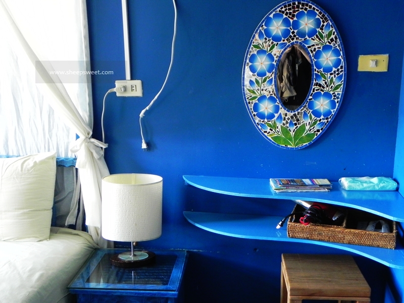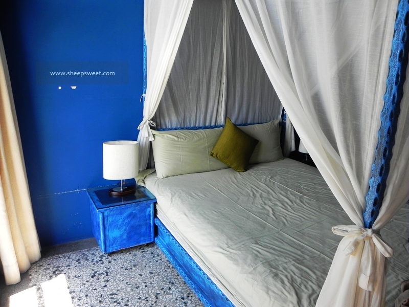听说女主人是美工科毕业的,亲自动手设计每一个房间。我们住的这间就很有地中海 风情,大面积的纯蓝色,白色的布幔,马赛 克地砖,很是浪漫。