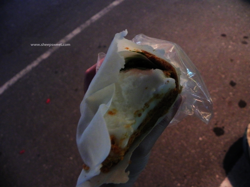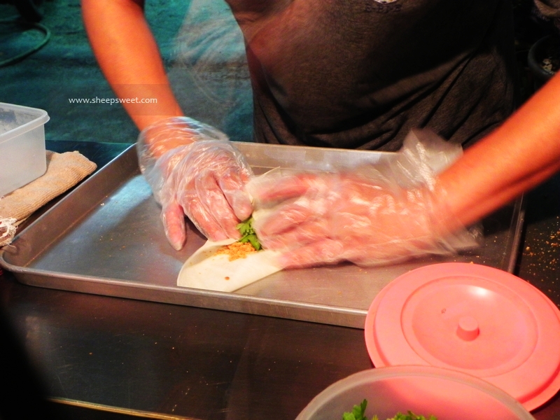 这是一个年近40的阿姨手工制作的古早味甜点。一张不知道什么皮,卷着冰欺凌和花生末,还有香菜,还配一些糖酥。一个35NT。口感还不错,对了sheep的胃口。