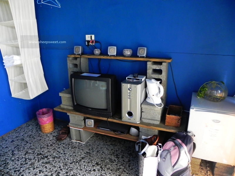 双人房不算小,就是电视什么的这些标配电器很小巧,居然是我小时候家里用的球屏电视诶,当时我就震惊了!还配备了音箱,隔壁的冰箱上还有一盆没养鱼的水草鱼缸,还装点着一些很有原住民图案的摆件。无不体现女主人静心设计的巧思。