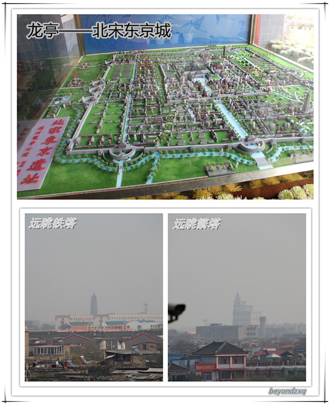 上图是北宋东京 城示意,下两图是在龙亭上远眺铁塔和繁塔。两座塔在上图都有示意。