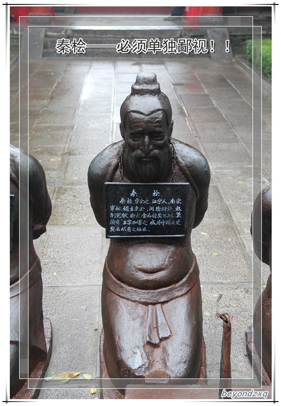 进门正中就是这个五个注定要遗臭万年的历史罪人,从左至右依次是:万俟卨(mò qí Xiè)、张俊、秦桧夫妇、罗汝楫。身前插立着皮鞭,供游人鞭打。不过,皮鞭也破损了,年久失修?至于秦桧,不得不单独拿出来鄙视一下,如此无耻之徒,完全是为了自身的荣华富贵,致使懦弱的赵构在龟缩偏安的路上越走越远。里通境外、陷害忠良。