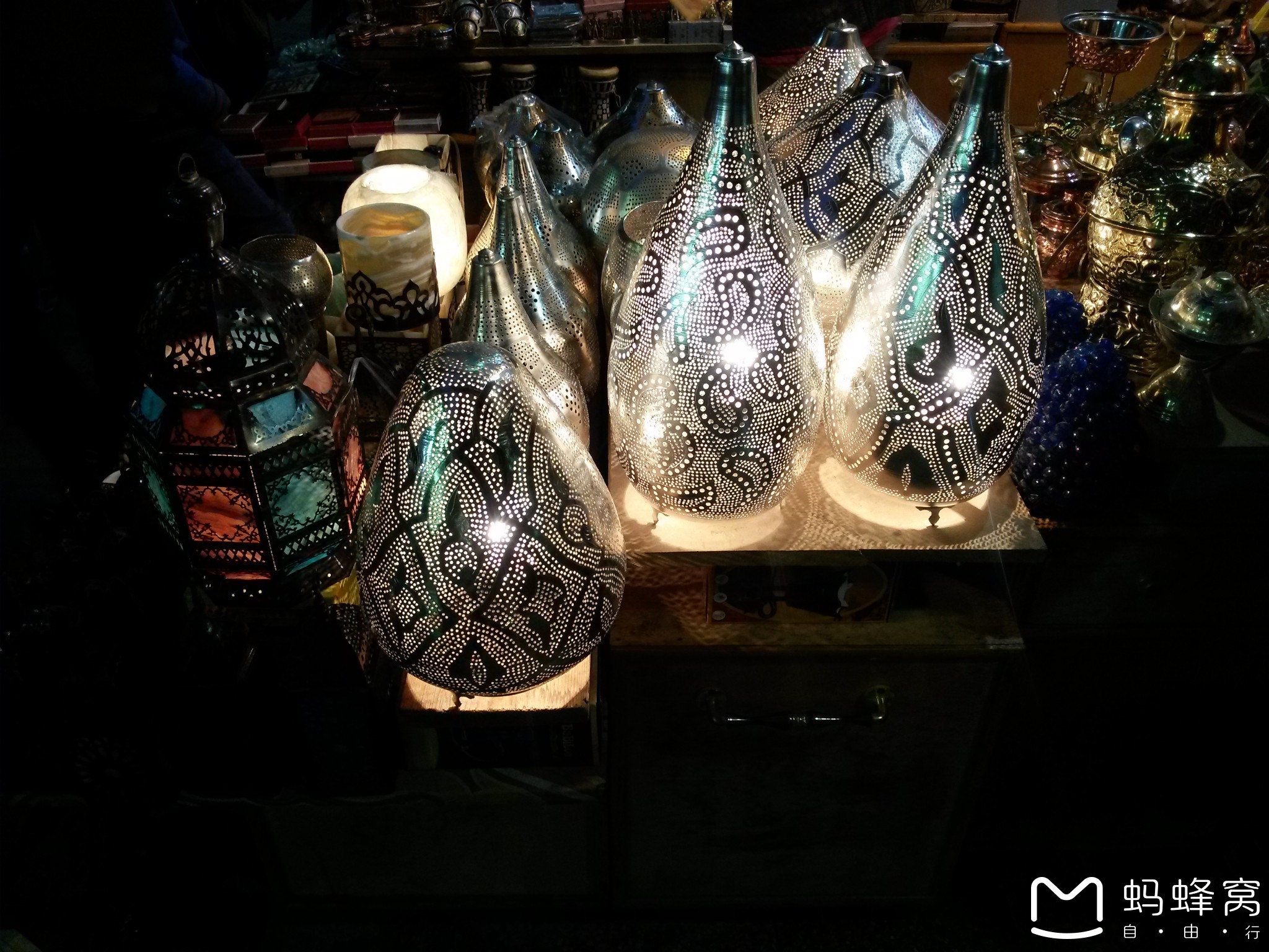 埃及还有一个大家都会去的地方,就是哈利里市场,这个市场位于开罗老城区,原是皇族墓地,拆毁后建起了市场,市场旁边就是著名的艾兹清真寺和侯赛因清真寺。哈利里有许多店铺的历史可以追溯到14世纪呢。我们去的时候已经快到傍晚了,几十条小街小巷布满了几千家店铺,门面紧挨着门面,金银首饰、铜盘、石雕、各式工艺品琳琅满目,许多店员会使用不同的语言跟你吆喝,“你好,我好,大家好”听上去是如此地与时俱进哇;我买了埃及的特产雪花石制成的杯子,灯光往里一照玲珑剔透,很喜欢;顺便喝了芒果汁,很纯很甜很浓,就是会跟游客收取服务费,变相挣钱。这个市场的店铺密密麻麻的,游客川流不息,这点还不是最奇特的,最牛的是我们的大巴司机,居然可以在这样既窄又拥挤的小路上一路前行,还带转弯,哇晒,活脱脱牛人一个哇!