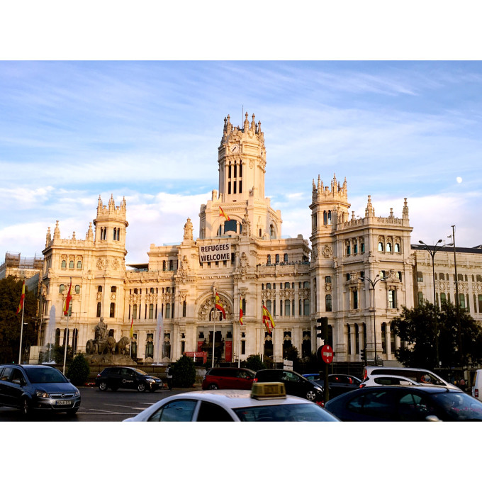 可以看到邮局大楼上面挂着大大的横幅“欢迎难民”。西班牙街道上可以看到很多难民,有的残疾在乞讨,有的带着狗狗睡在路边,男女老少皆有。。。数量可以和美国的流浪汉pk了。。。