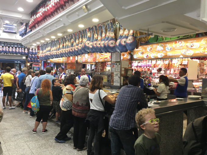 出来之后我们已经饥肠辘辘了,搜索了一下附近好吃的店,锁定了太阳门广场附近的火腿博物馆,一层是当地人站着吃肉喝酒的地方,二层有可以坐着的桌子和卫生间,亚洲人很多,还有旅行团~服务还可以,欧洲的啤酒真的不是盖的,蜜瓜火腿也不错~还有套餐里送的海鲜汤比较符合亚洲人的胃口~除此之外其他味道很一般~(出门在外选定餐厅都靠大众点评!所以我们选的餐厅通常都很火爆而且亚洲人很多!)板鸭人民中午吃饭时间一般在下午2点,不过一些店12点也开门了,尤其是游客比较多的地方,餐厅里总会有人坐着,几点吃饭的都有,因此不用太过担心提前或错过饭点儿~