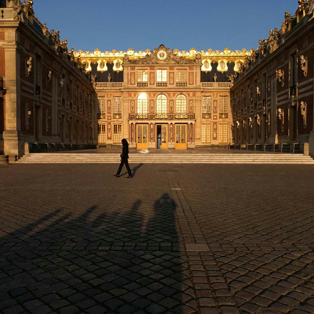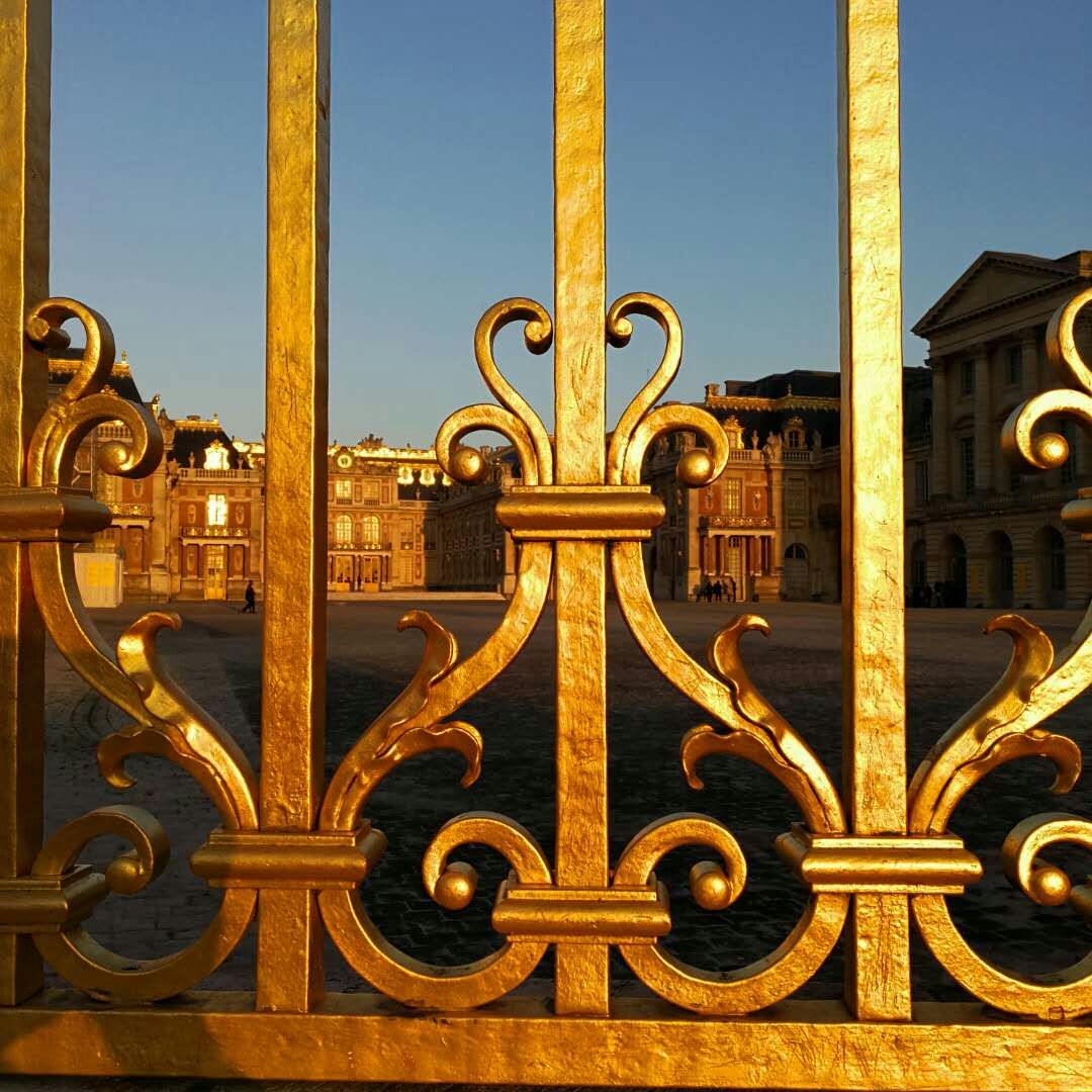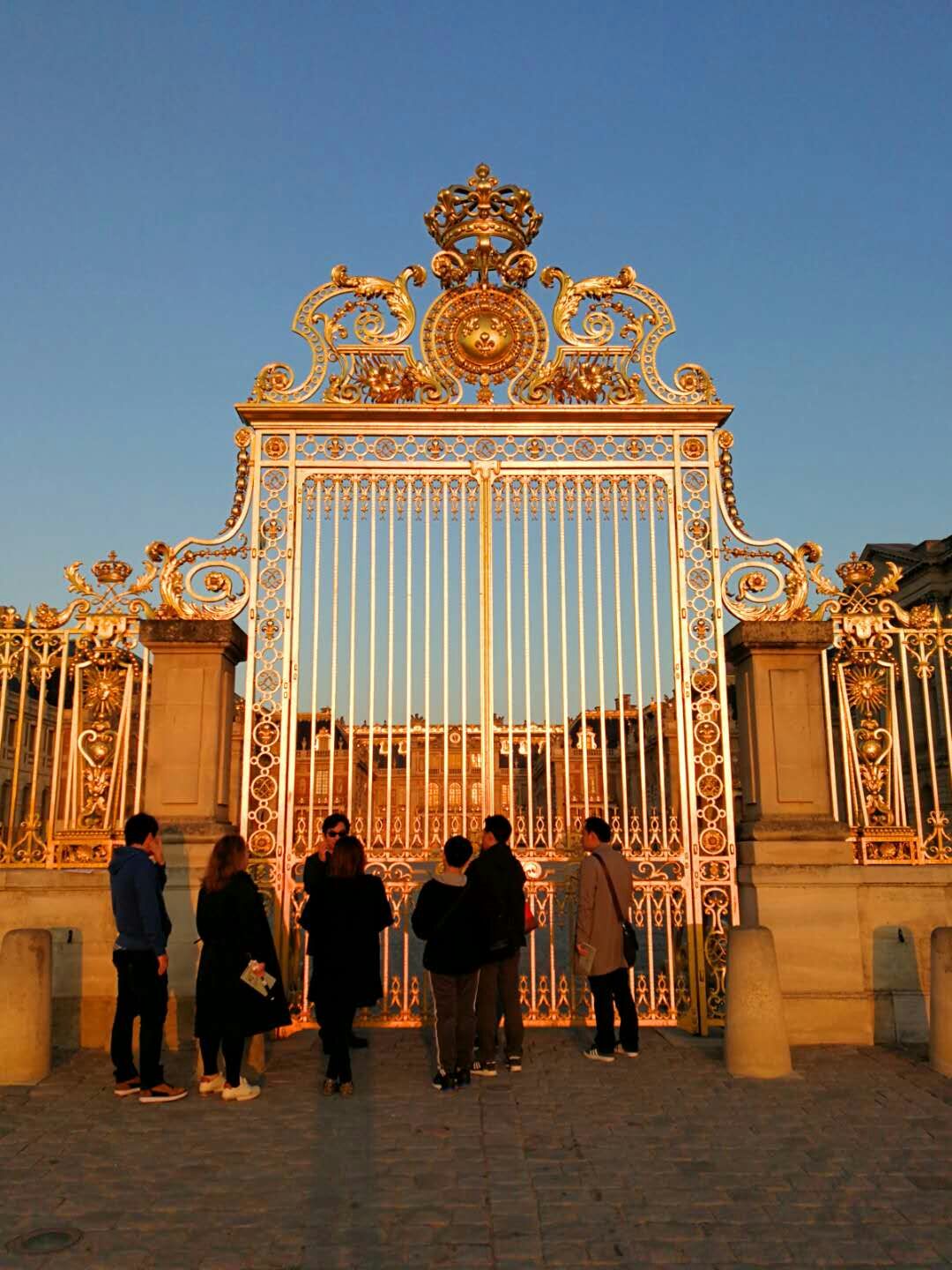 凡尔赛宫9点钟开门,我们8:30就到了。初升的太阳把凡尔赛宫大门映成金红色。