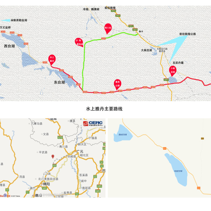 90%的游者奔扑敦煌、莫高窟,因为那里确实太有名了,这将导致他们错过最美公路和世界上独一无二的水上雅丹(见下图红线部分)。这里还未形成热门景区,只有一簇簇大自然鬼斧神工造就水上雅丹,静静的散发着自己独特的魅力。