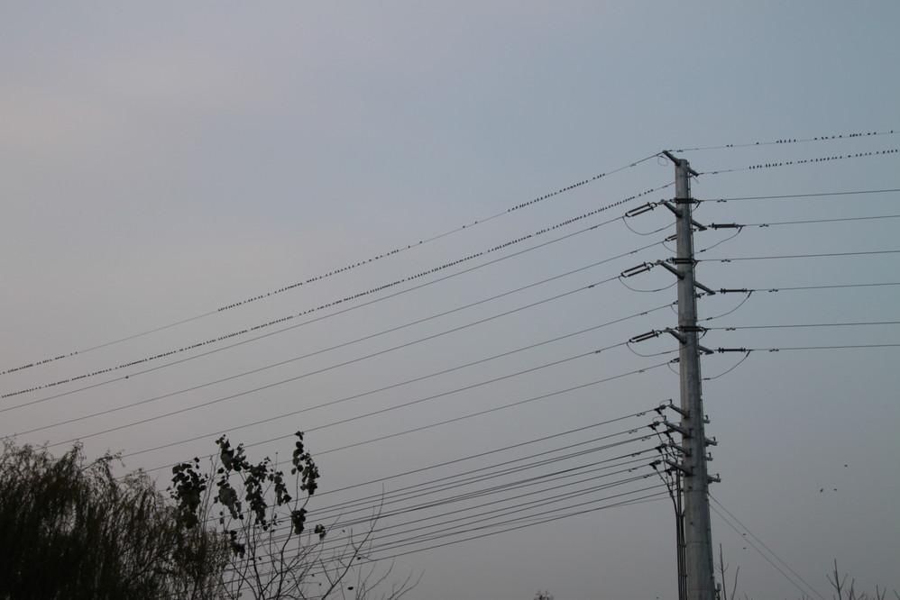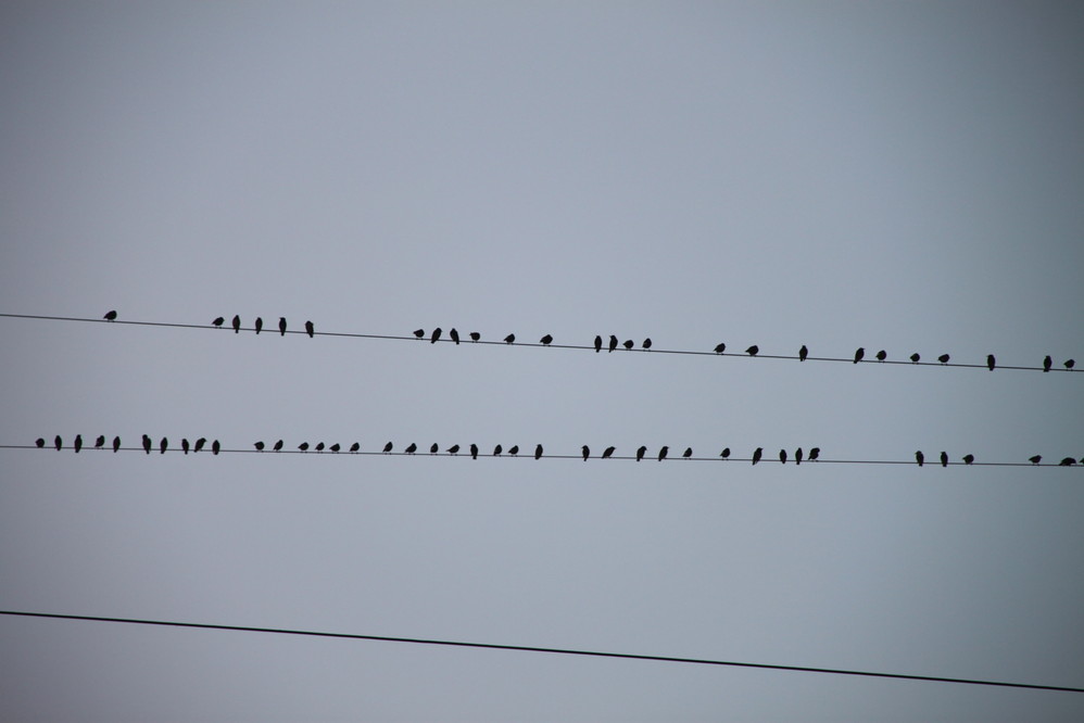 落了一整个电线的小鸟。
