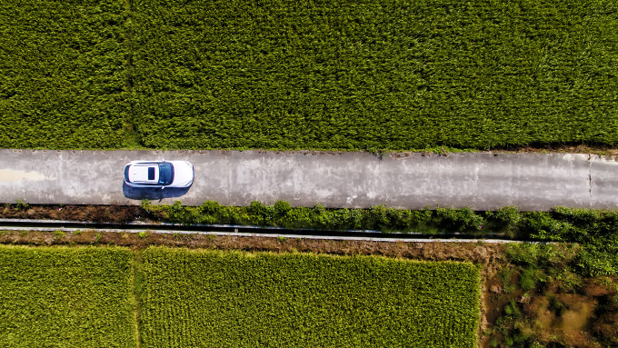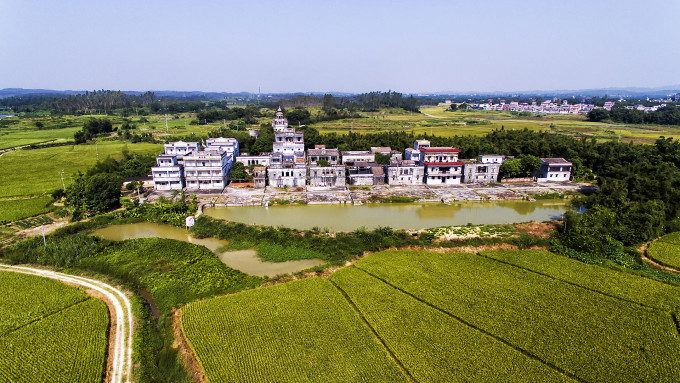 绿油油的田地,一车宽的乡间小道,一个个精致的村庄散布其间,我忍不住拿出航拍器环顾四周。