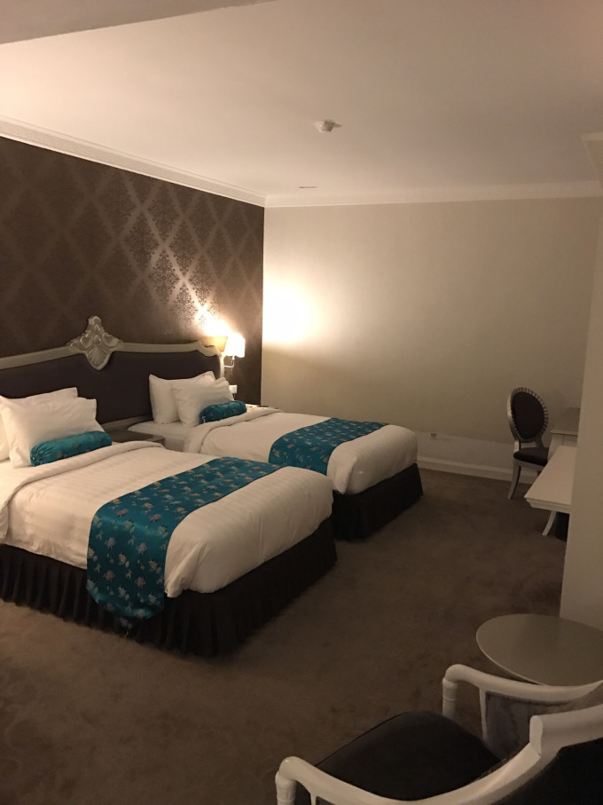 话说在夜市附近找停车位的路上,我指着路旁的酒店说有想住这家 RC hotel ,不过超出了我们的预算(大概新币一百/四人),随口说了句,不如下车去问问可以减价吗,反正现在也不早了,可能可以便宜点!结果我真的下车去,到了前台问了四人房的的价钱,他说四人房沒了,只有两人房,一间Rm280,交涉了好几分钟,下删五百个字,最后以马币180成交,不含早餐。我们四人睡一间,因为人好好的前台小小声说他们家的单人床两个人睡也可以的