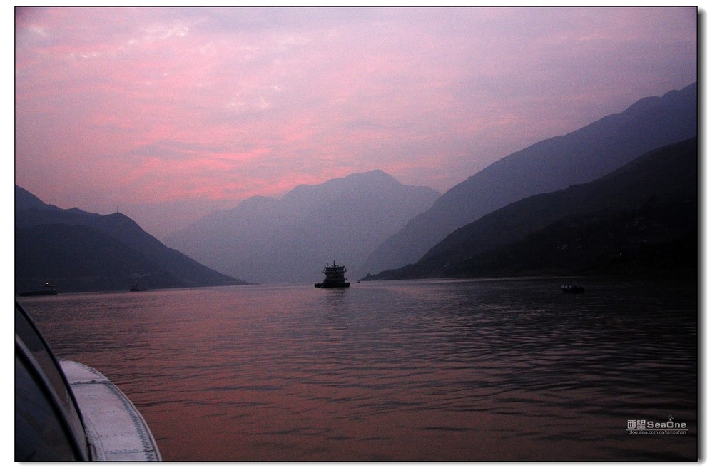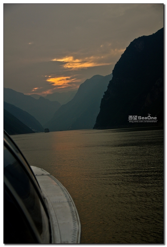 天色逐渐暗了下来,两条腿也站得几乎僵硬,一瘸一拐的回到座位。这时我和王冬才发现我俩背后竟然坐着两个重刑犯,全部带着手铐!!!虽然旁边有便衣警察看着,依然让我我俩心中忐忑不已,总感觉两人会一跃而起用手铐勒住我俩的脖子做人质。这种心惊胆战的感觉着实难受,于是我俩决定离开座位到船舷呆着,远离这两个随时可能爆炸的火药桶,夜晚寒冷的江风中挨到奉节。