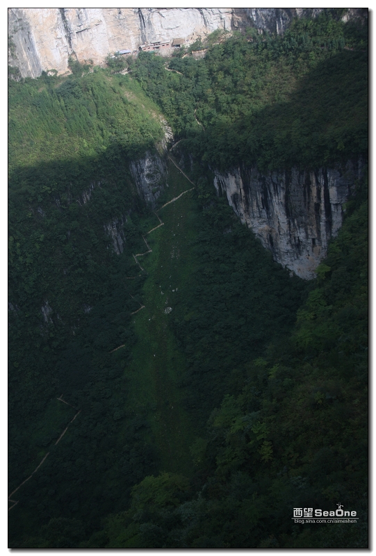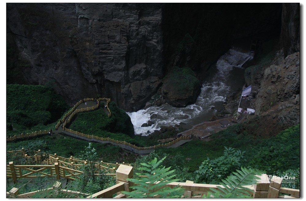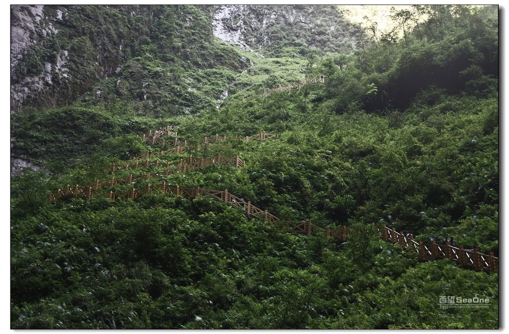 站在景区门口的观景台(9点20))只能看到天坑的顶部,天坑的四周如同斧劈刀削,直落千丈,只有一条弯弯曲曲的木栈道直通坑底。天坑有多高?如果把台北101大厦或者上海环球金融中心扔进这个坑里,将完全看不到,而我们马上要做的,就是要从这里下到坑底,相当于从一栋超过200层的大楼顶下到一层!!!还好是下坡,大家也没有背包,对于体力的影响不算大,依靠着双杖的帮助,大家边走边玩,大约100分钟后到达坑底。