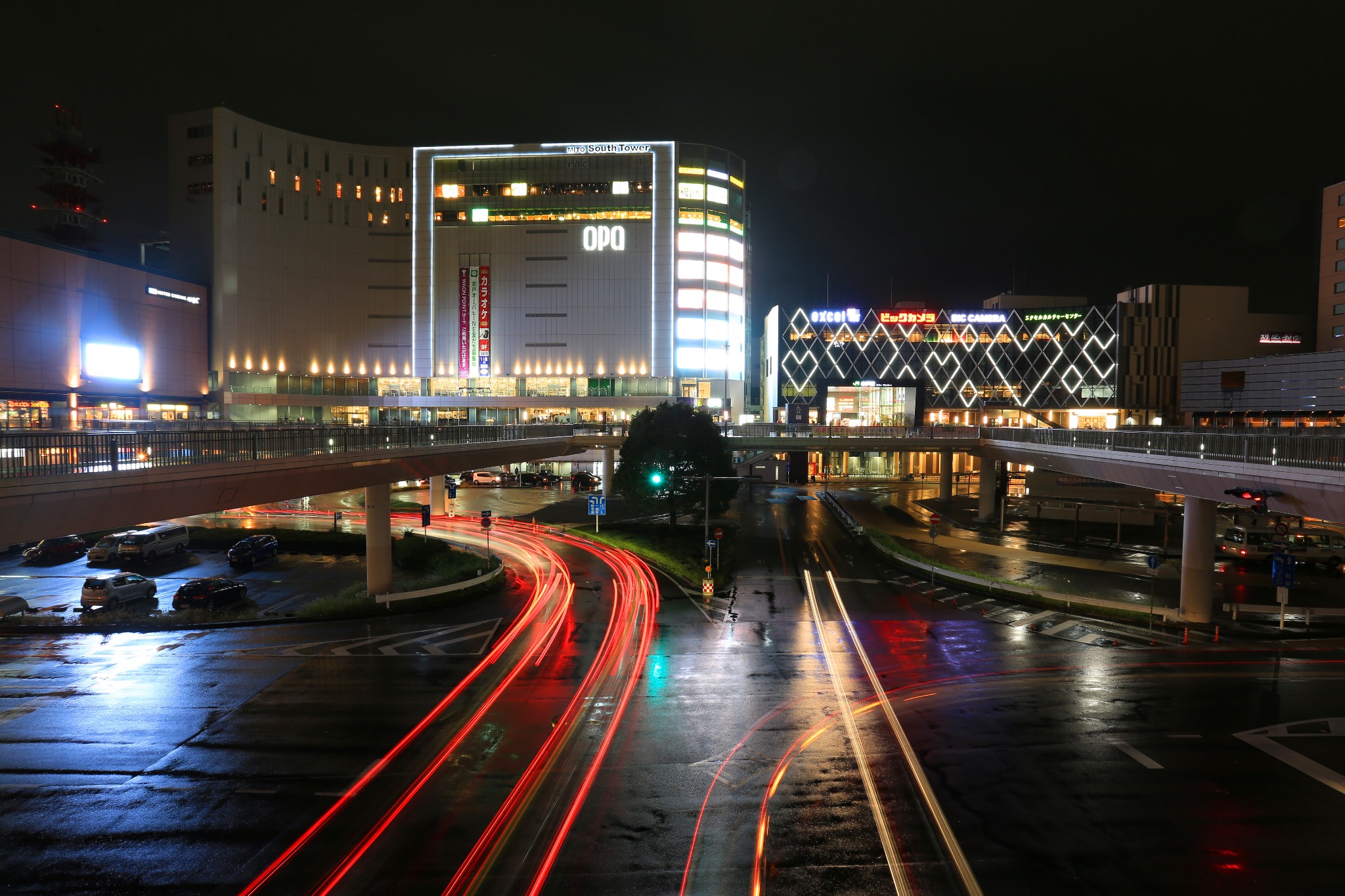 水户车站南口 有一片广场,广场上有环形天桥,细雨之夜、忍寒在此拍摄水户夜景