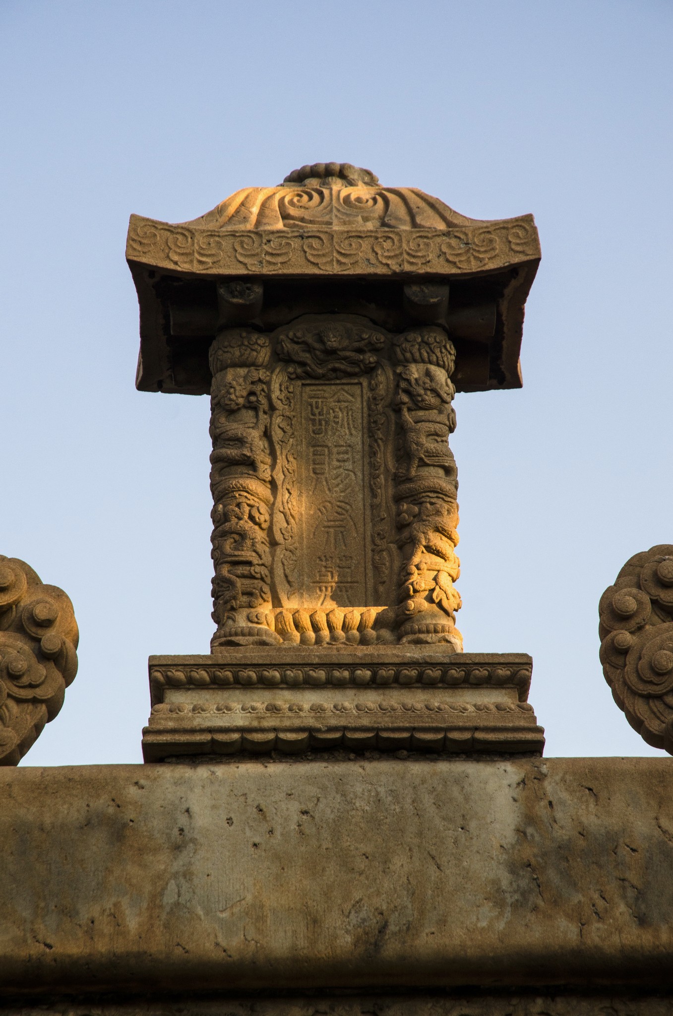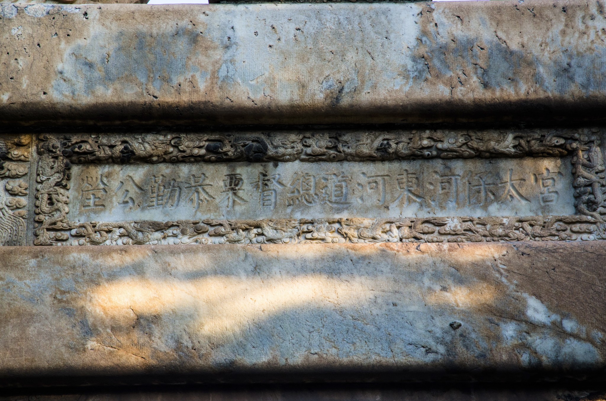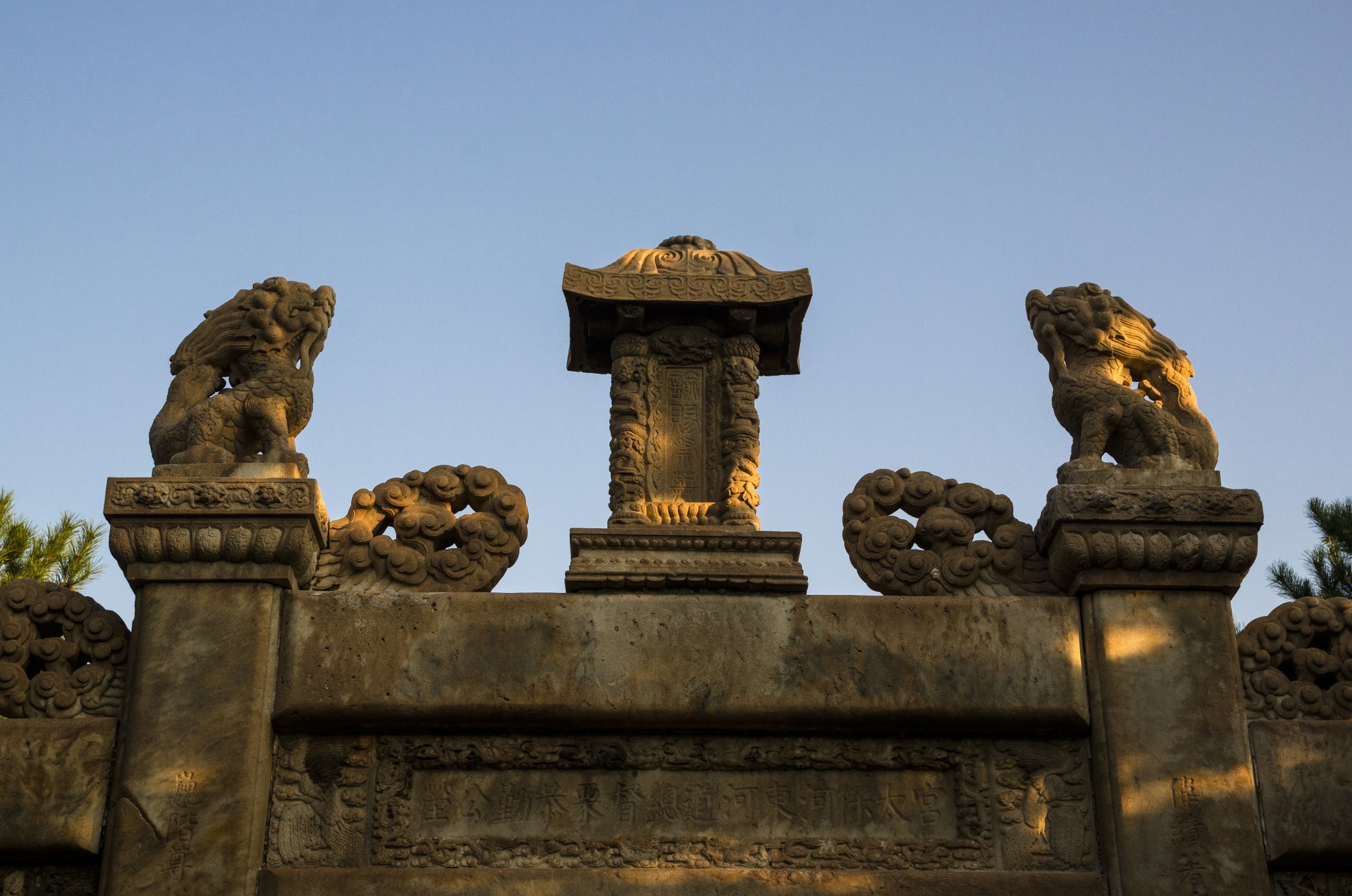 亭下横额雕:"宫太保河东道河总督栗恭勤公茔"