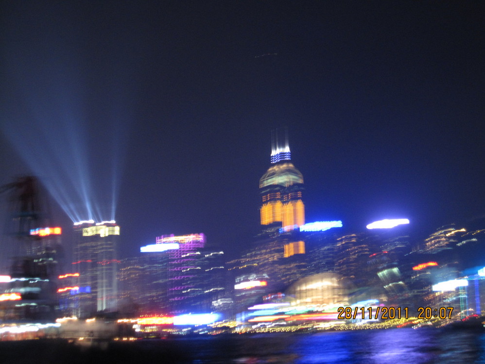 我们在8点过几分感到 幻彩咏香江已经开始,其实就是对面的楼的灯的变幻啥的,实际好看,我的相机出来效果都不好了。