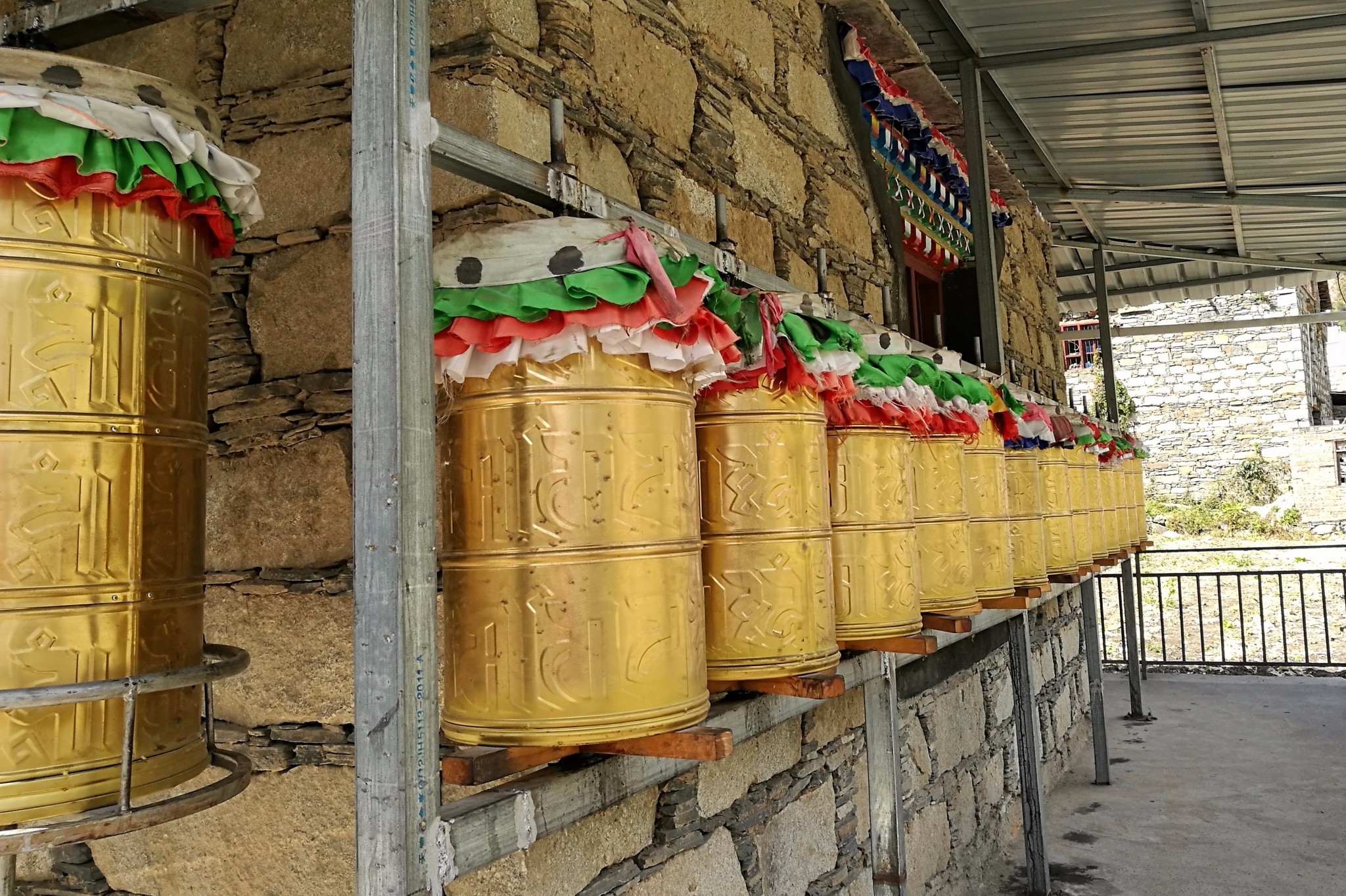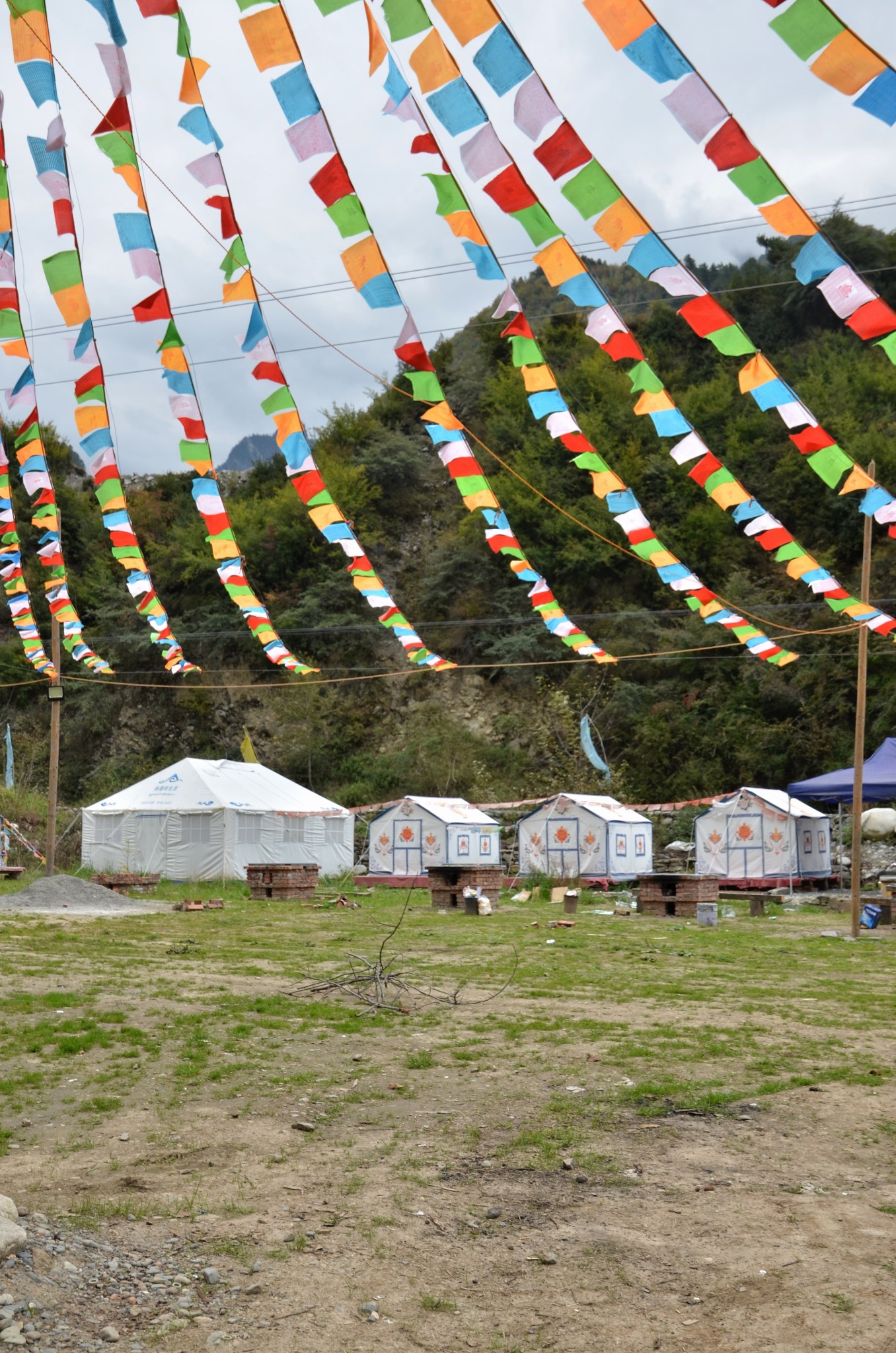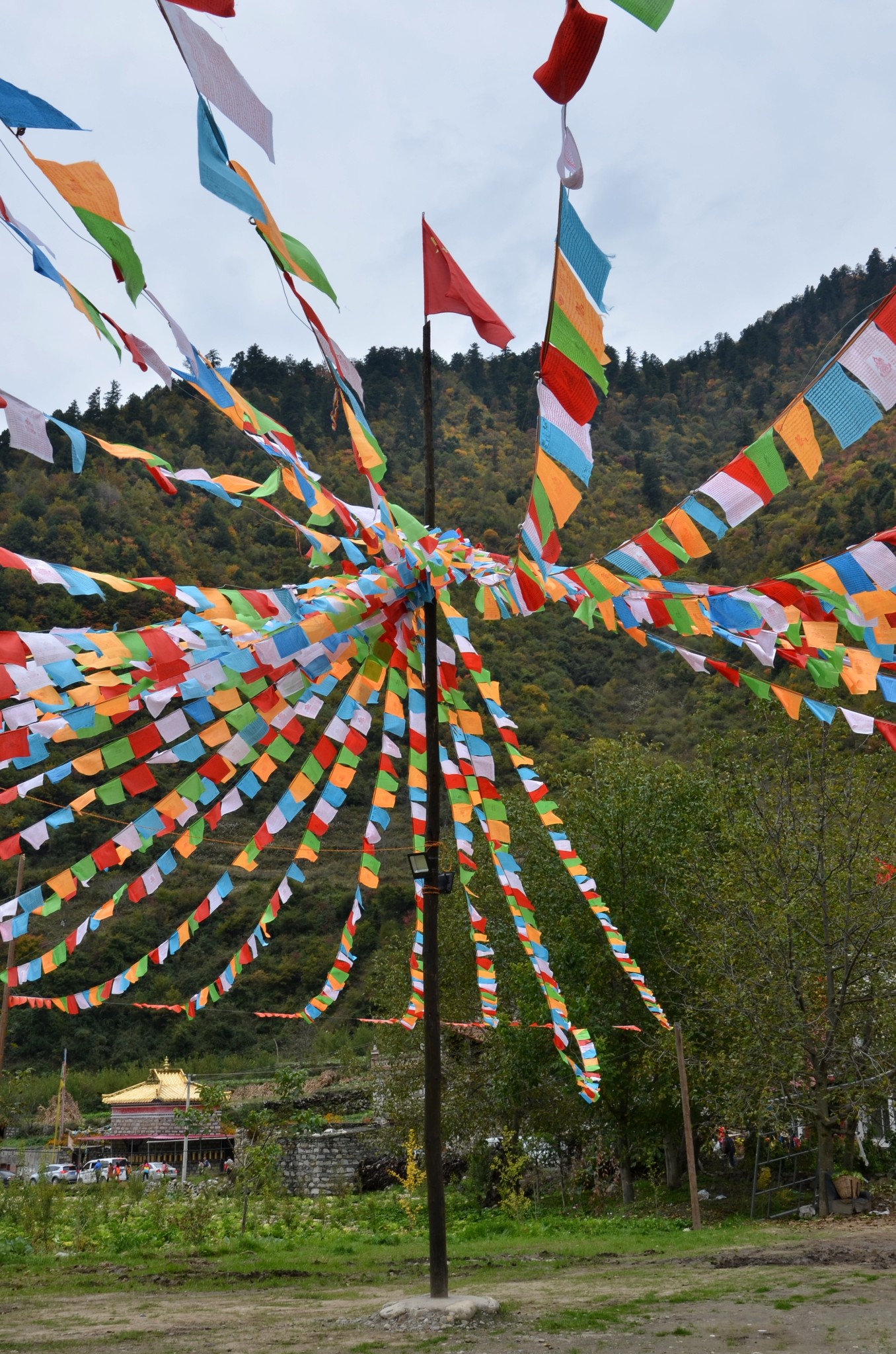 随处可见挂在山顶山口、江畔河边、道旁以及寺庙等各处被认为有灵气地方的五彩经幡。最顶端为蓝色幡条,它象征蓝天;蓝色幡条下面是白色幡条,象征白云;白色幡条下面是红色幡条,象征火焰;红色幡条下面是绿色幡条在征绿水;最下面的幡条是黄色,象征黄土,或者大地。五种颜色的排列形式正是客观大自然物质存在的立体排列形式,因此,象大自然中天地不容颠倒一样,这五种颜色也不容错位。