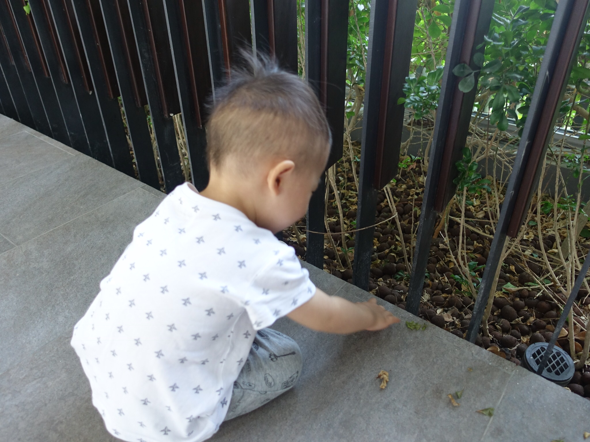 最后我们还是找了一个树荫的地方玩沙子。去之前我就没带什么沙滩玩具,因为觉得汤圆不会玩,还特别担心他吃沙子。事实上,他对沙子还是处于一个初步探索的阶段,就是抓起来感受一下,铲一下之类的。以及对于学步期的他来说,赤脚走在沙滩和草坪上也是一种不错的体验。