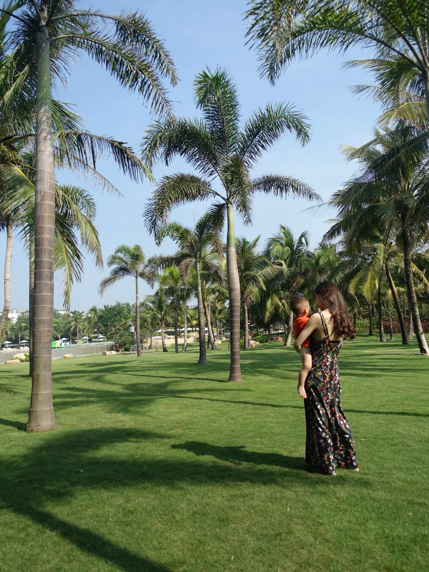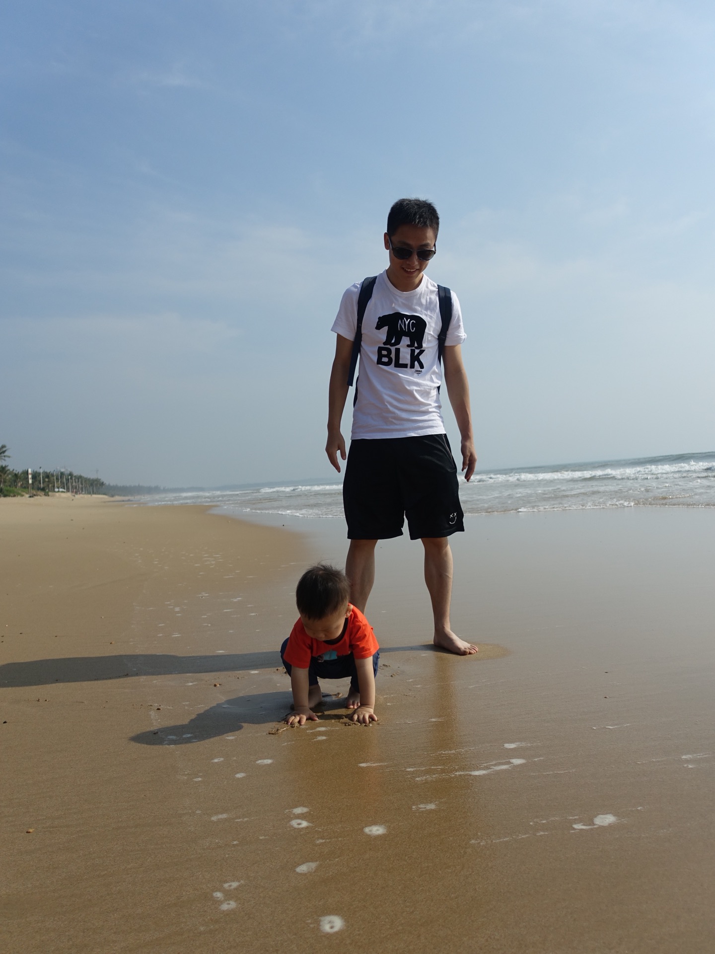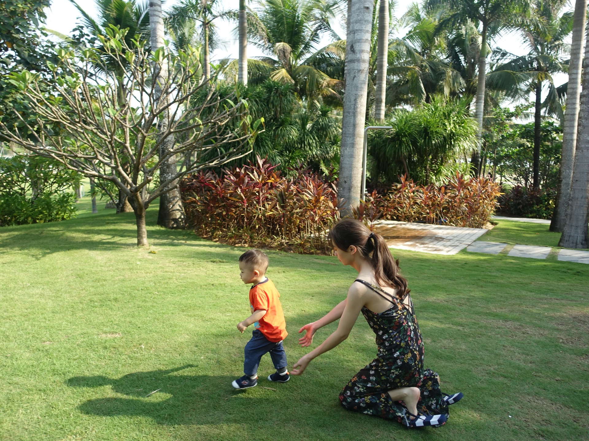 早餐完毕我们就迫不及待地跑到海边去了。大概是因为早起的缘故,我们一行人承包了整个沙滩、草坪和椰树林。我姐和恬恬两个在那里追海浪玩得不亦乐乎,外婆一直在旁边喃喃自语“不要走开去了……胆子怎么这么大……要被卷走的……”。汤圆则是对海浪恐惧不已。即使踩到水呵呵一笑也是立马要爬到嘟的怀里。用“惊涛骇浪”来形容海棠湾的海浪是有些夸张,但是远远地看着我姐和恬恬,感觉如果一个不小心没躲开的话,也是分分钟会被卷走的。