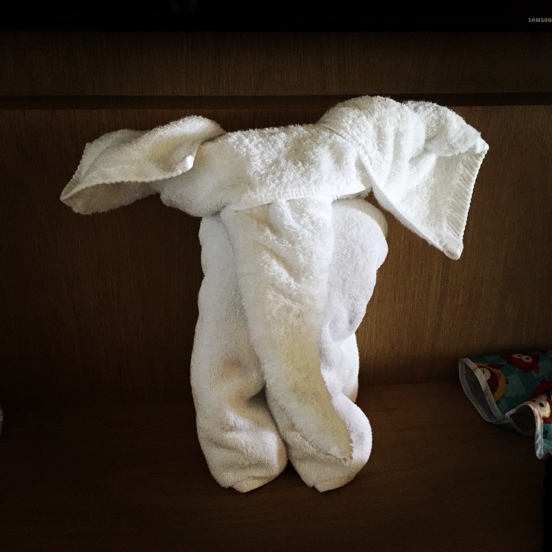 回到客房洗澡的时候遇到了打扫卫生的服务生,是个平头的胖胖的男人。(嘟说“咦,郭德纲在给我们打扫卫生。”)服务生还特别贴心地给每个小朋友都用毛巾叠了小动物。给汤圆叠了大象和兔子。超有爱的。