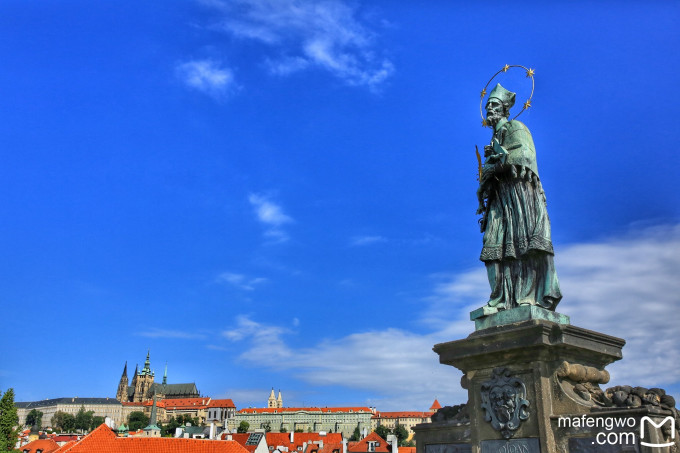 这是查理大桥上最著名的雕像人物---内波穆克圣约翰,根据雕像基座上传记所说,1393年温塞斯拉斯四世把圣约翰捆上铠甲,从桥上扔下河里溺死,因为他拒绝泄露皇后忏悔的内容。据说他头上光环的星星随着尸体沉入河中。传说如果你擦拭这块古铜胸章,终有一天你还会回到布拉格。