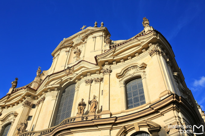 唉,既然已经这样了,不如接着走可能会暖和一些吧,穿过查理大桥,沿着街道直走就是小城区里著名的圣尼古拉斯教堂,这座精美的巴洛克风格建筑,宏伟而不失精致。可惜今天来晚了,教堂关门了,明天再来试试吧,就只能在教堂前的广场拍两张了。