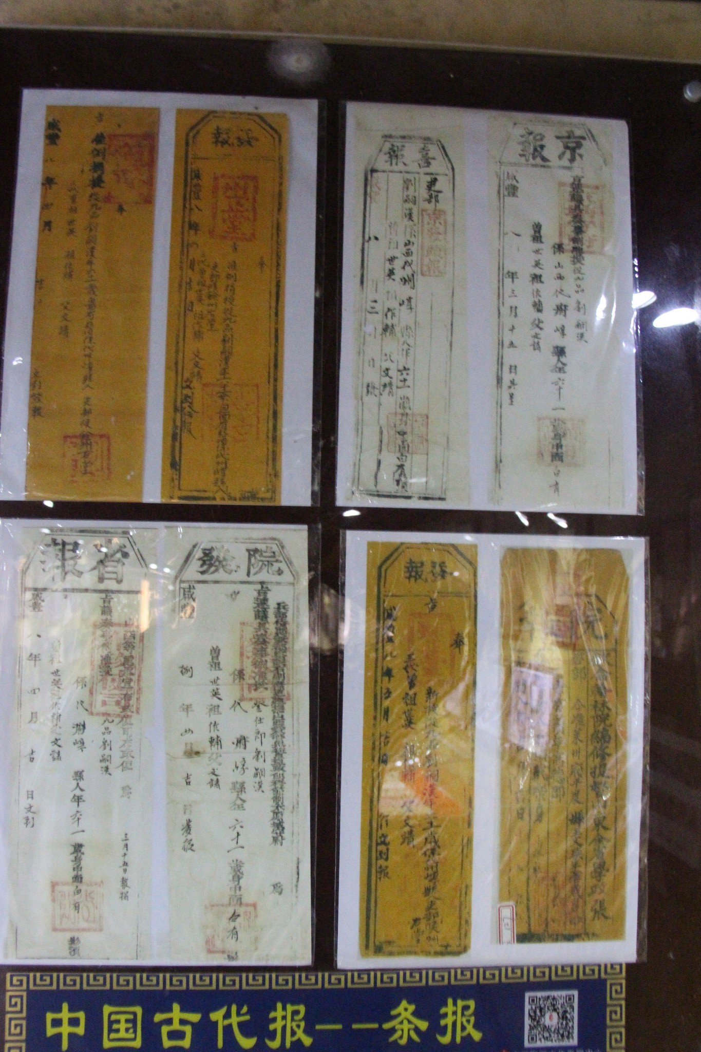 清代邸报,"邸报"最早出现于汉朝。当时西汉实行郡县制,全国分成若干个郡,郡下再分若干个县。各郡在京城长安都设有办事处,这个住处叫做"邸",派有常驻代表,他们的任务就是要在皇帝和各郡首长之间做联络工作,定期把皇帝的谕旨、诏书、臣僚奏议等官方文书以及宫廷大事等有关政治情报,写在竹简上或绢帛上,然后由信使骑着快马,通过秦朝建立起来的驿道,传送到各郡长官。但有史可依的中国最早的报纸,起源于唐朝的邸报。邸报是中国古代报纸的统称,但这个称呼出现,是从宋朝开始的。
