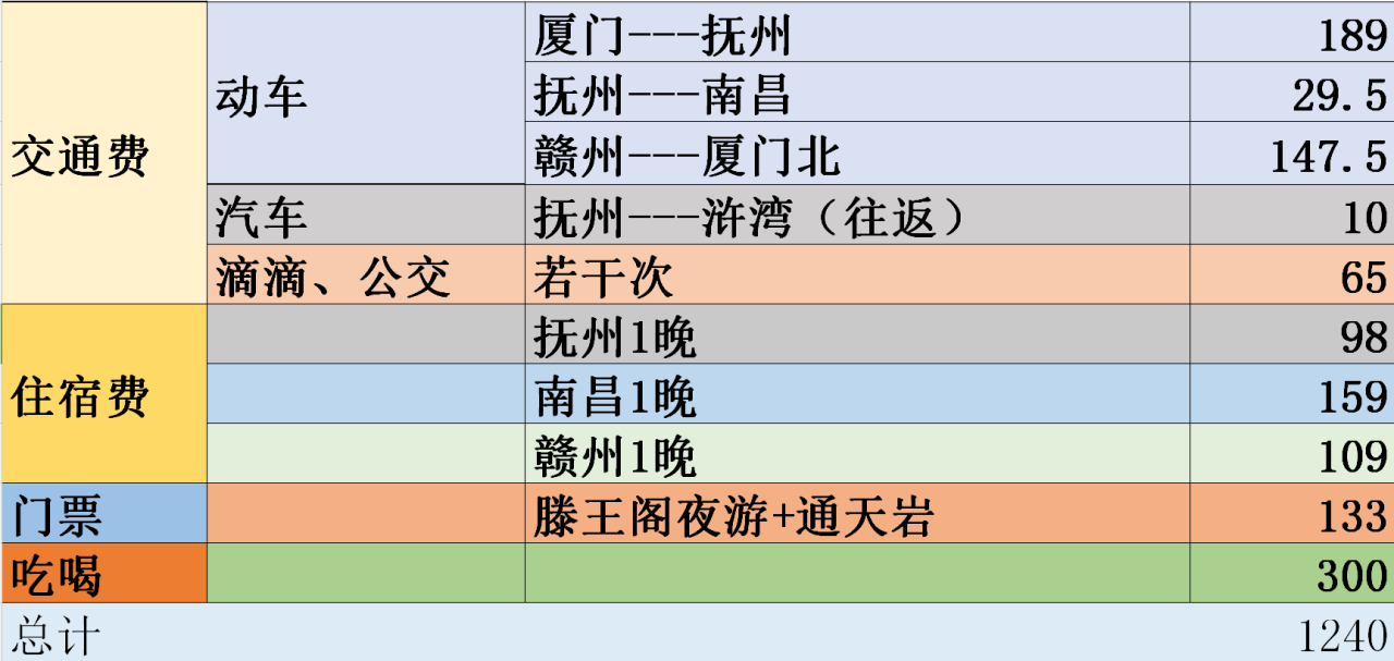 本次旅行的大概花费,因为三个城市都不算国庆热门的旅游目的地,所以在住宿餐饮方面没有太多的溢价,先上花费一览表。