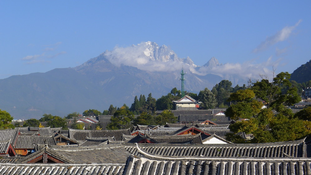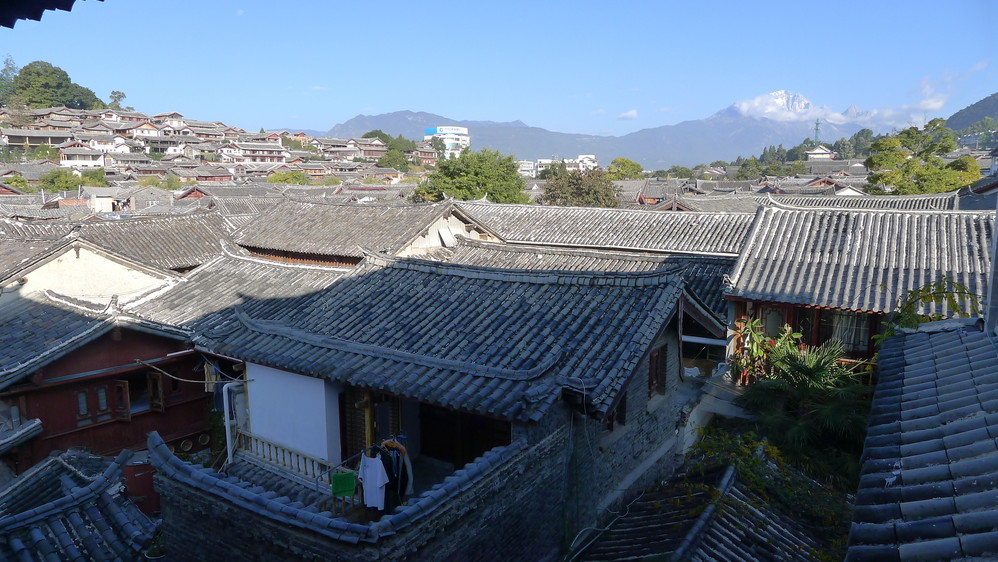 古城青旅的三楼视野还算开阔,正对面就是玉龙雪山 。