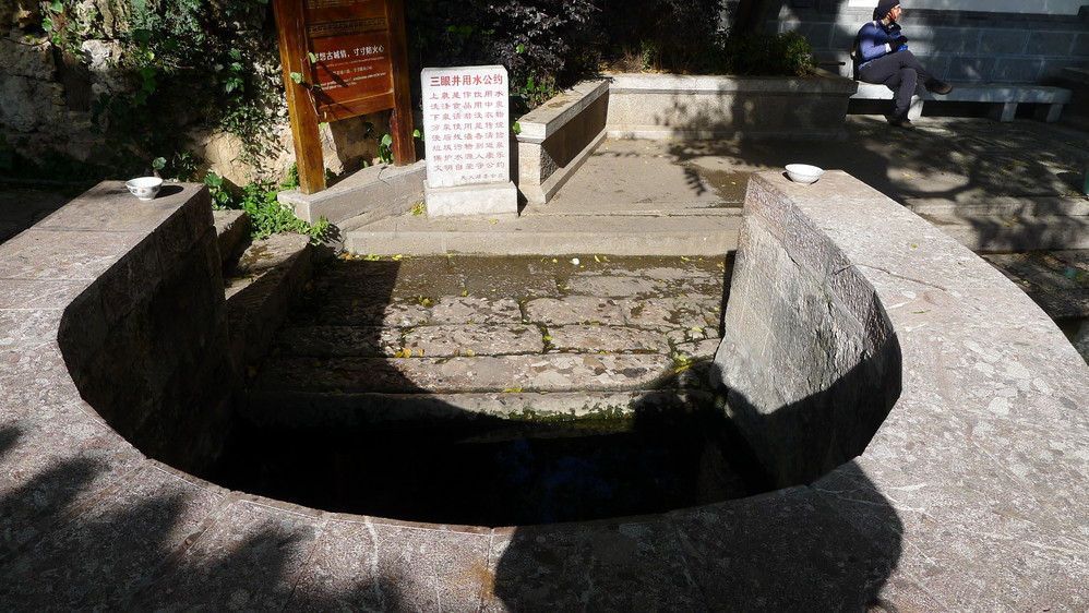 在丽江 的小巷里面随意的走着,来到这一出泉水旁边,三个井眼用处不同,人们很自觉的遵守这个约定,第一口饮水全边摆着一只碗,供人喝水用,我喝了一碗,清澈甘甜!一个老外在泉边的墙角下晒着太阳,悠闲自得。