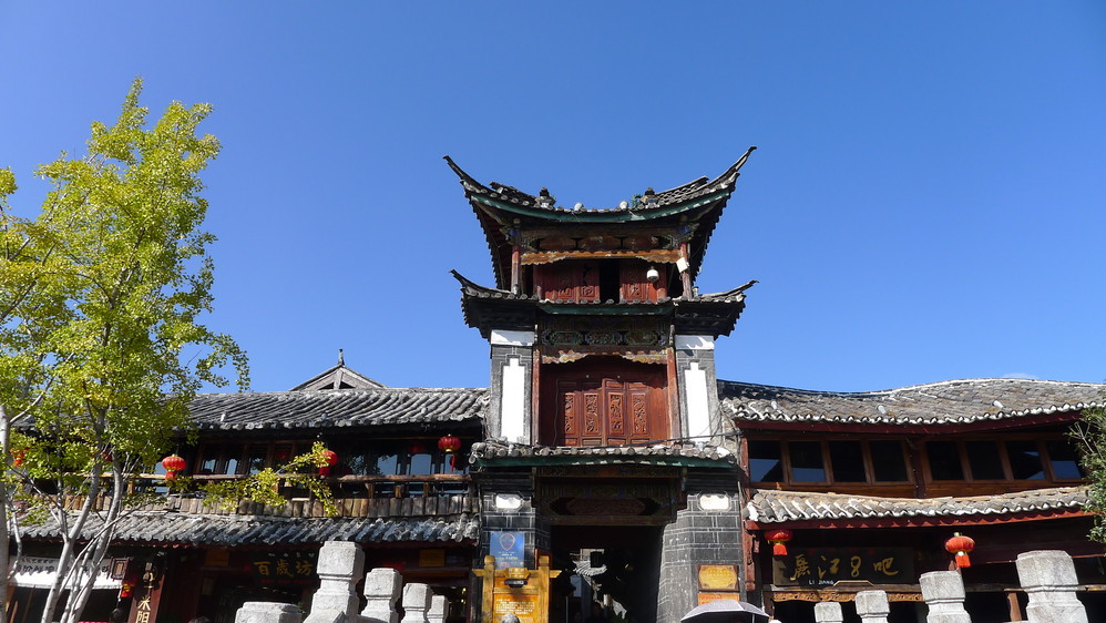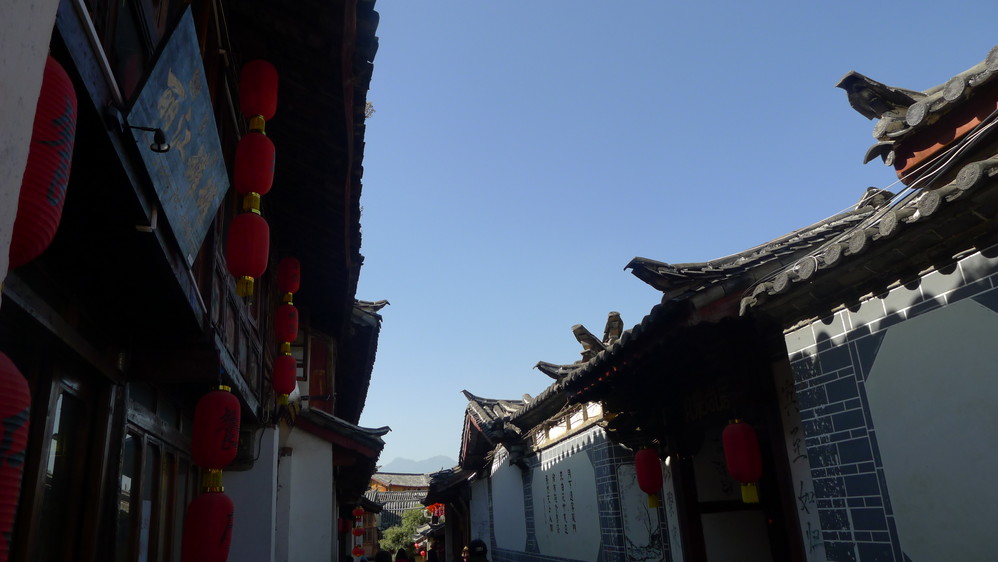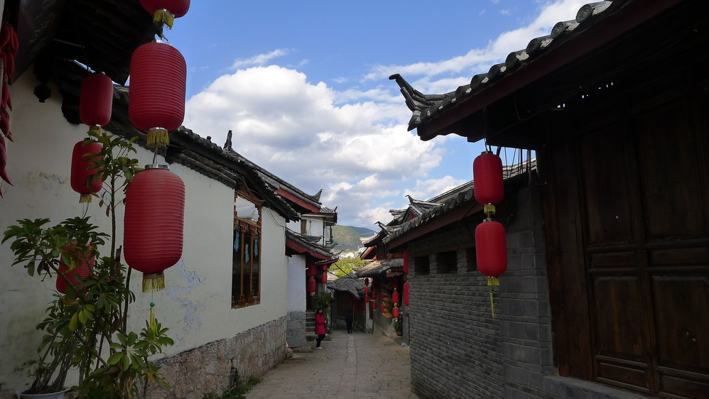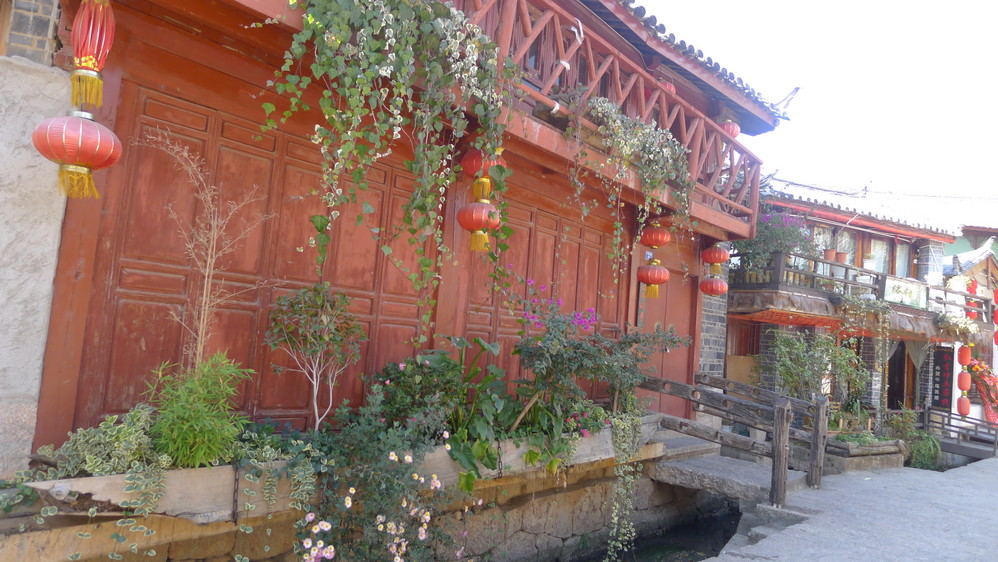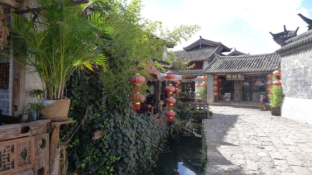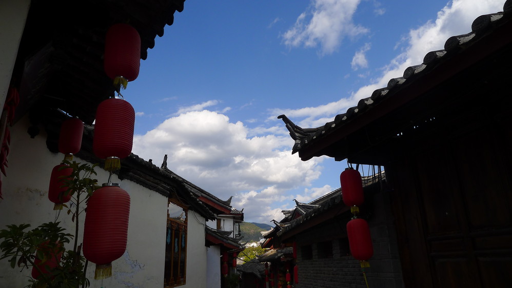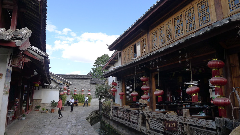 蓝天,白云,古建筑,红灯笼,小桥,流水,店铺,行人,一起构成独有韵味的丽江 图画。