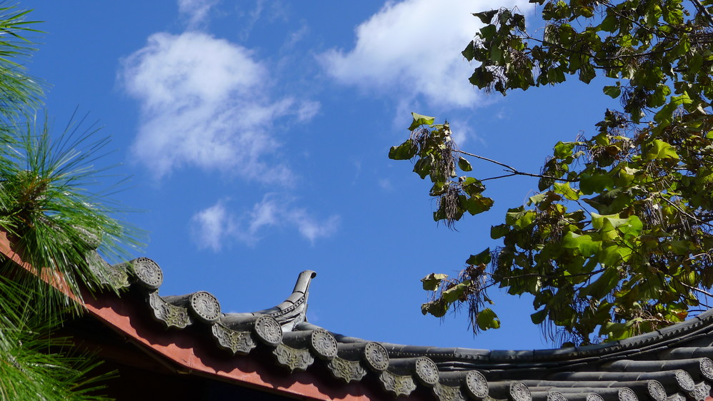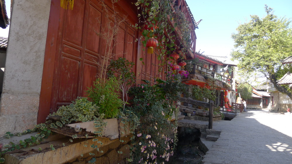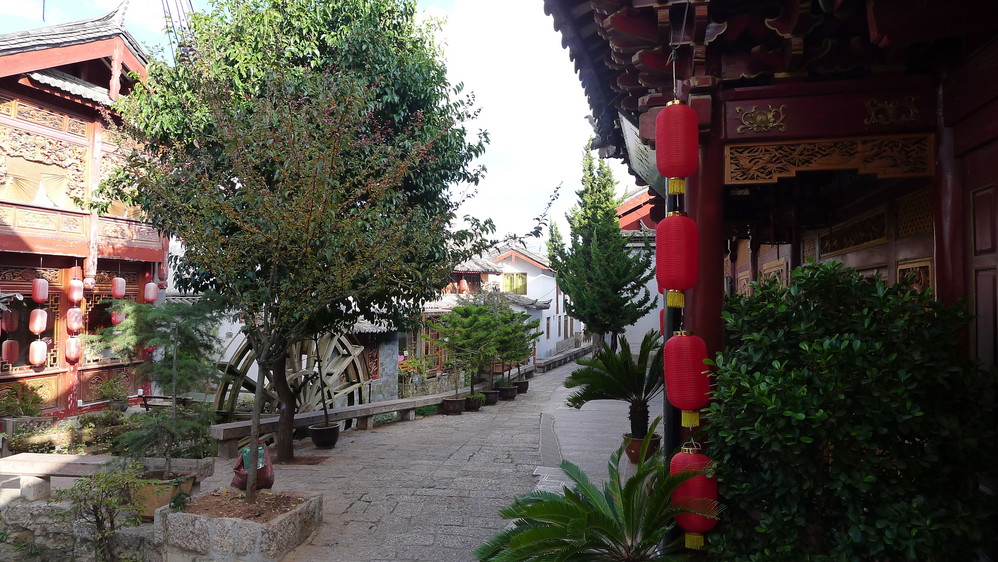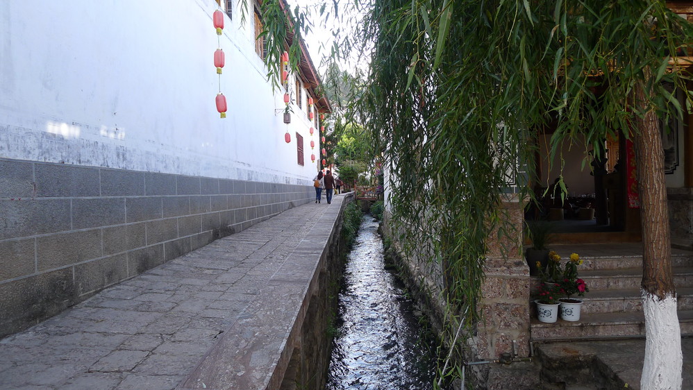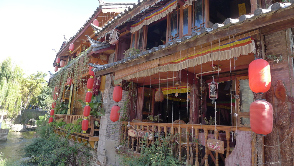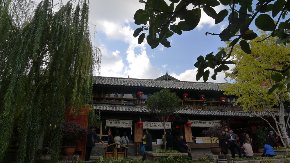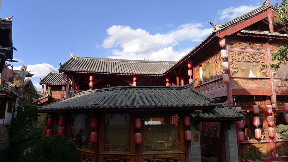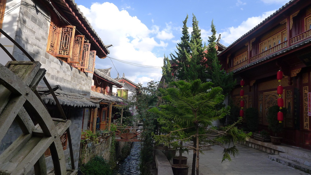 蓝天,白云,古建筑,红灯笼,小桥,流水,店铺,行人,一起构成独有韵味的丽江 图画。