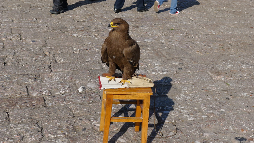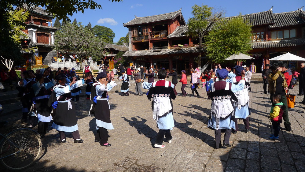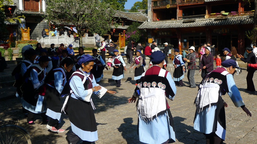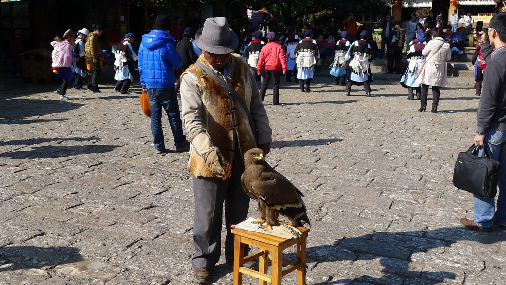 四方街上有人身着民族服饰,牵着马,带着鹰,提供拍照服务,一群纳西族老太太在这里跳着民族舞蹈,吸引游人驻足观看。