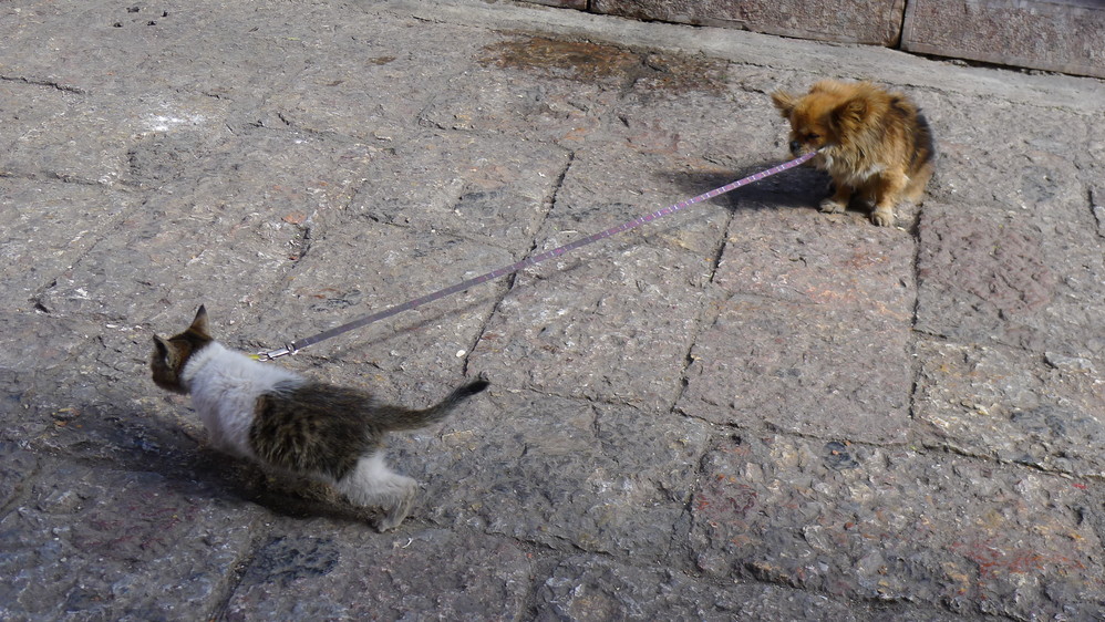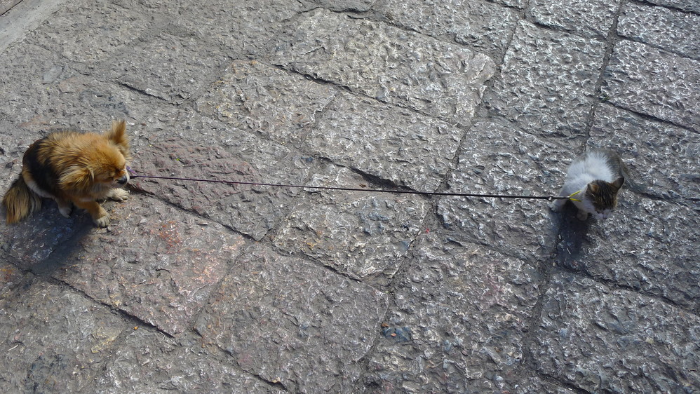 路上看到一对小狗被主人拴在了一起,黄色那只好像很困的样子,白色那只则一直想挣脱这个绳子,不过黄色的小狗很淡定,这主人太坏了!