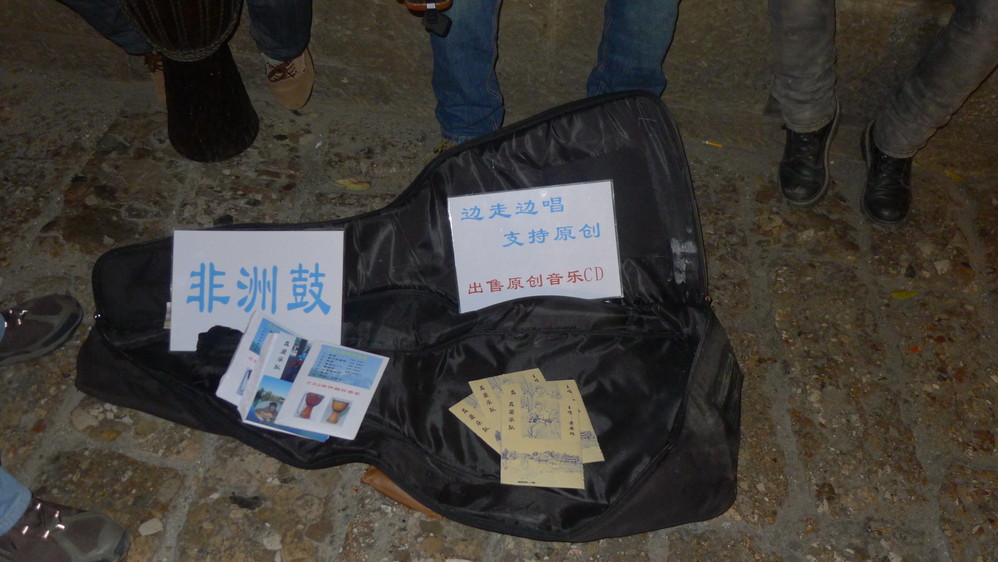 关门口附近的民间歌手,边弹边唱,顺便卖自己的原创专辑,50元每本