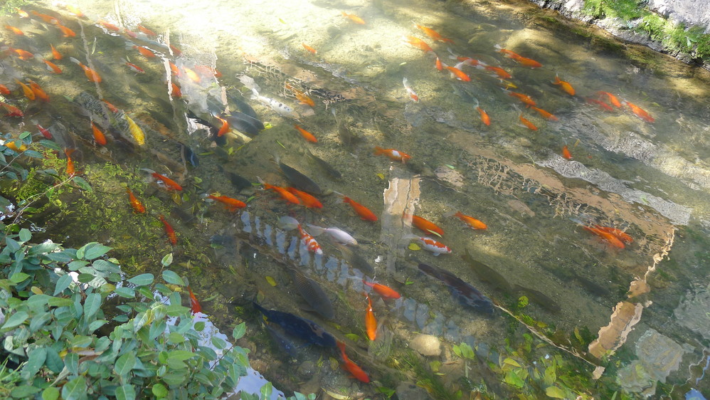 河里的金鱼头逆着水流的方向,排成一排,还是比较整齐的,不知道他们是在操练还是在干吗?