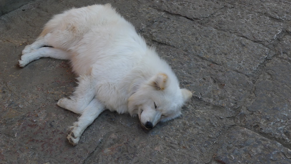 一只萨摩耶慵懒的躺在地上,有人说丽江 的狗是世界上最幸福的狗。
