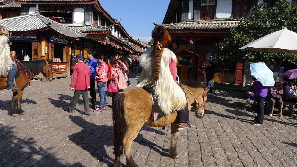 即将离开束河 的时候,蜜蜂,媚媚等人被宰街上拉客的本地人成功 拉上马,去茶马古道骑马去了。我对这个没什么兴趣,于是一个人回大研古镇。大研古镇和束河 古镇的街上都有很多这种本地人拉客去拉市海或者其他地方骑马的,看个人喜好了,开心最重要,不过去之前还是讲好行程价格为好,因为确实有人上当的。