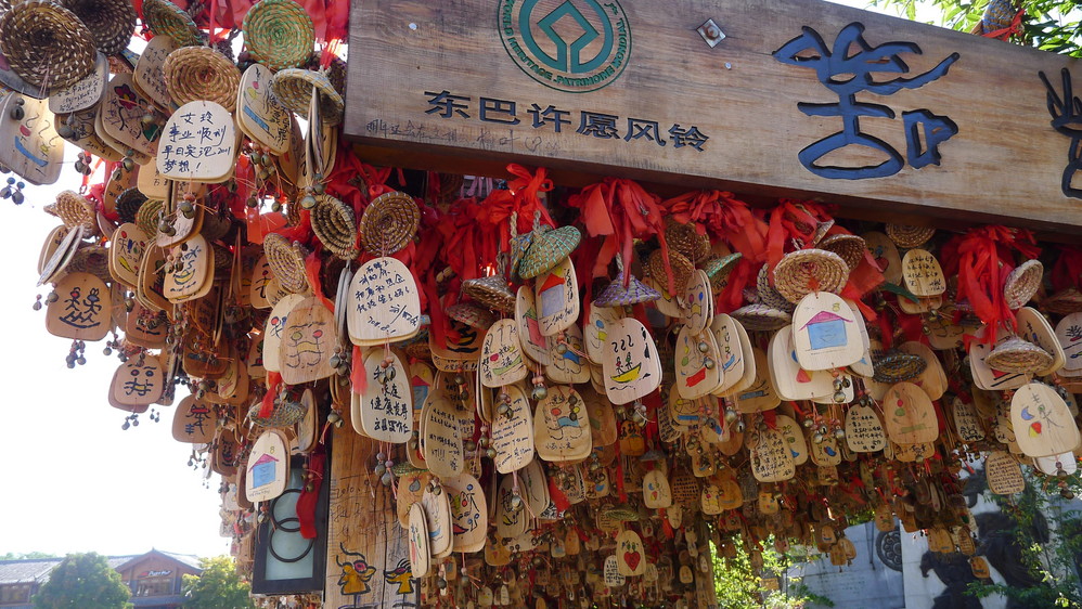 车旁边的东巴许愿风铃,挂满了各地游客的愿望,愿望真多啊!