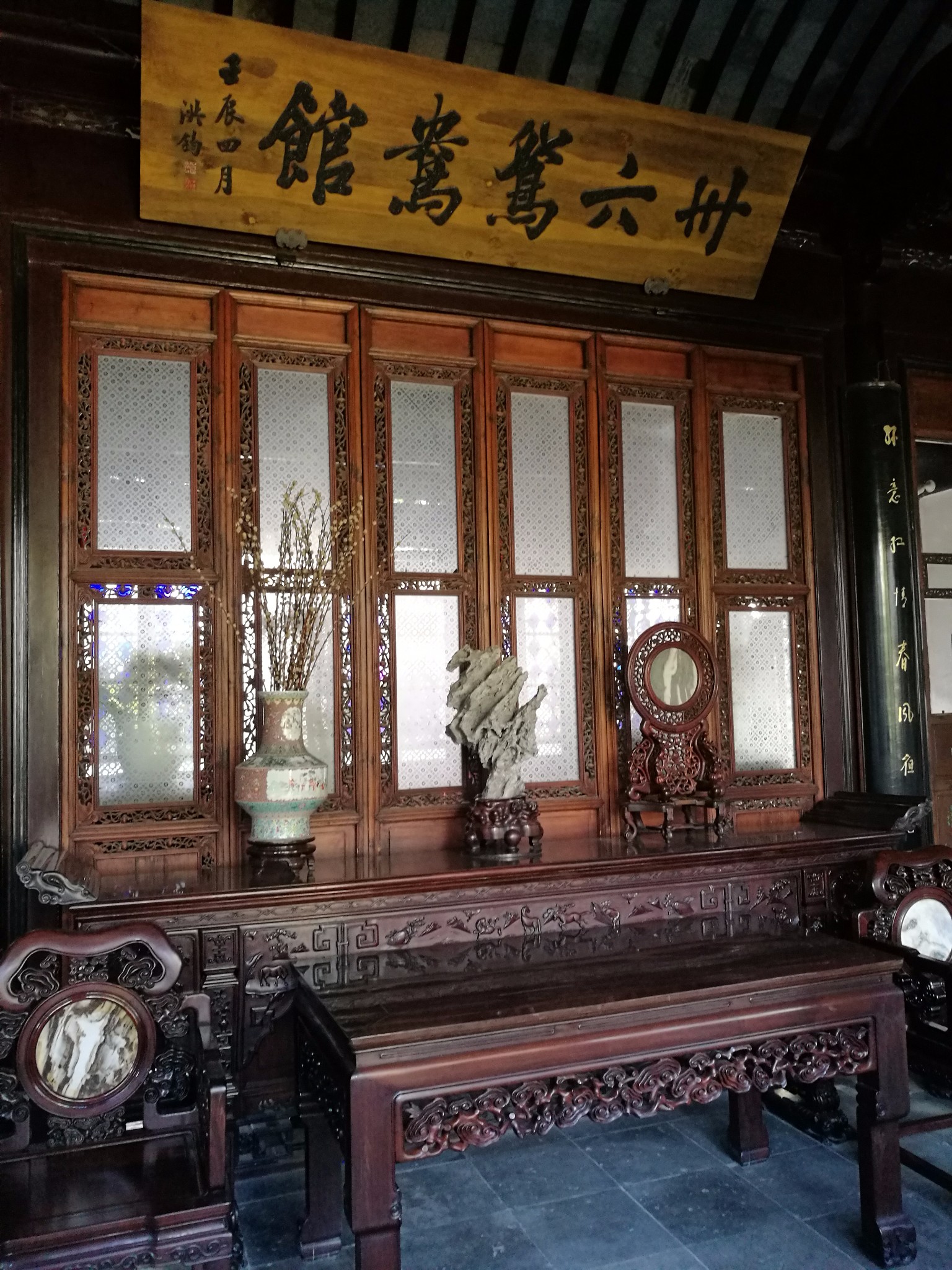 留园在苏州市内西北面,古典私家园林(清代风格),中国四大名园之一,5A景区,全国文保,世遗。有冠云峰(太湖石)、楠木殿(五峰仙馆)、雨过天晴图(大理石天然画)以及古代鱼化石等景点。