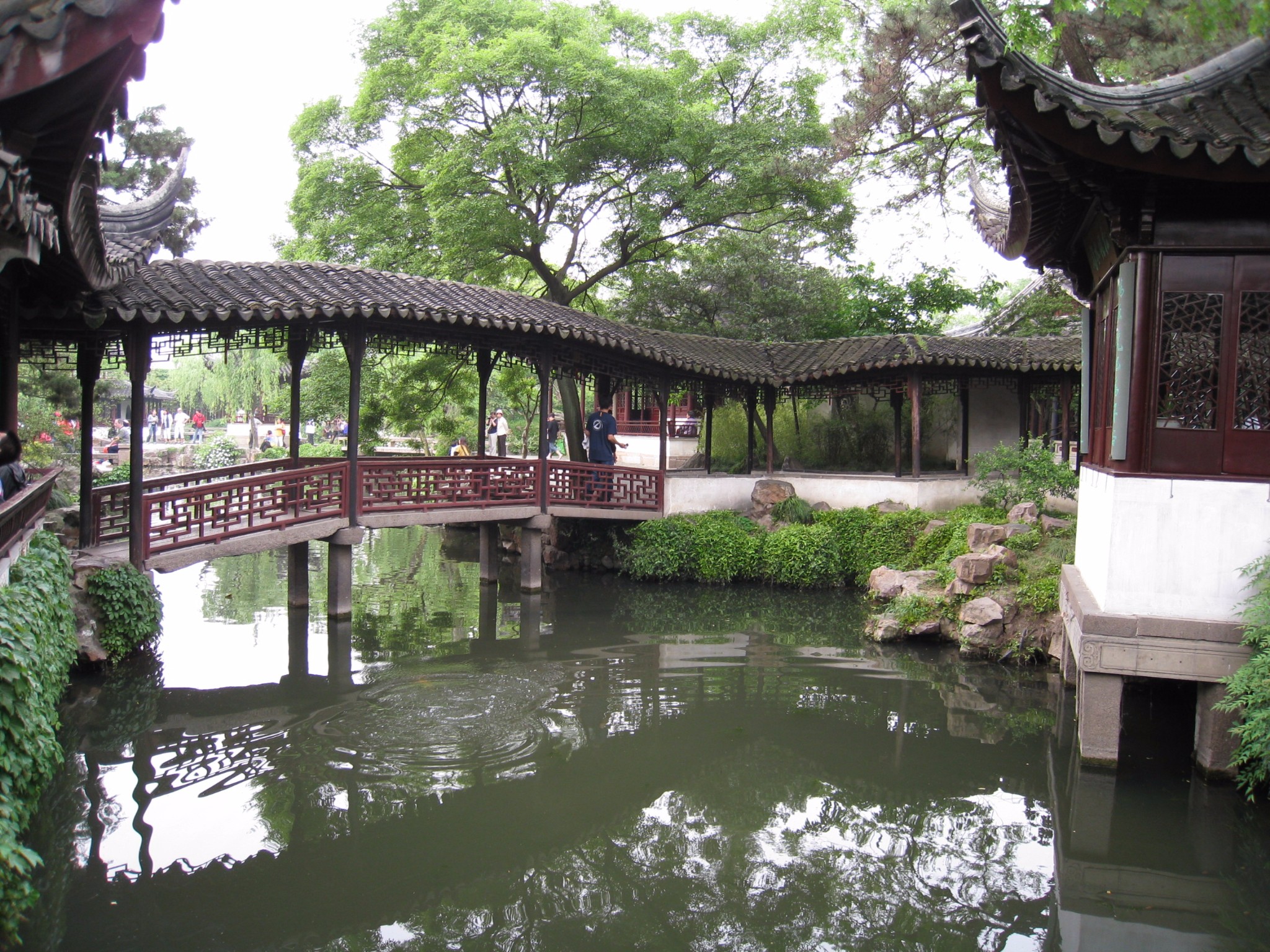 拙政园在苏州市东北面(东北街178号),始建于16世纪初(明朝),江南古典私家园林的代表,中国四大名园之一。全国文保,5A景区,世遗。500年来,几经易手,传说江南四大才子文征明设计过该园,曹雪芹家族也购买过该园。新中国成立前,园林破败,解放后政府开始保护、整修,1952年对外开放,1989年整修完工。园林以水为主,岸边构筑景点,自然、典雅、精巧、秀丽;以水见长,庭院错落,花木为胜。西花园的与谁同坐轩和后面的借笠亭叠加一起看有些像过去的官帽,令人称奇。小飞虹廊桥也很有特色。