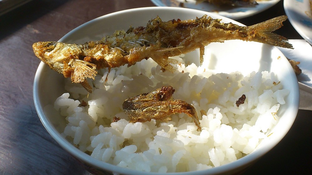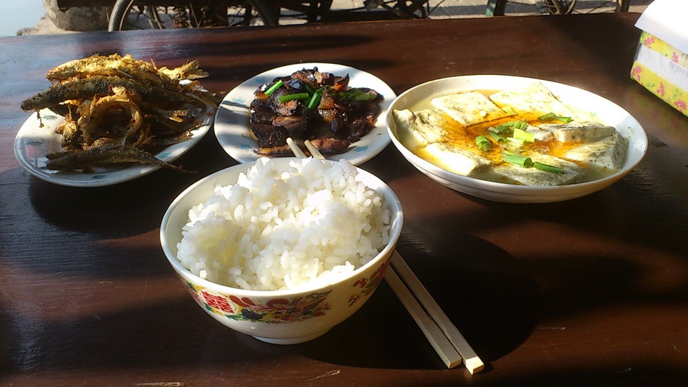 菜来喽,会否点太多了?细说一下,这家店的老板 很有特色,留着胡子,很会侃大山!点了菜后他和我聊了很多,说他是老板,很多电视台都找过他,他是绍兴的形象代言人等等……我好奇问他,为何前面那家店那么多客人呢?这里却没有客人呢?他很自豪说前面是他女儿开的,原来……再来说说我点的菜吧。第101碗煎小鱼(10元):河里现捞上来的,油里炸的小鱼儿。真心好吃啊~~就是肚子不剪开来,所以大鱼的话会苦……;蒸香肠(25元):满大街的香肠,我也来尝尝,其实味道不错,不是太咸,但是我还是喜欢广式的甜的香肠;蒸臭豆腐(8元):强烈推荐,真心好吃,真心臭~上海吃不到的美味~绍兴市也吃不到的美味~话说,这顿吃的我撑死了,一个人全部把饭菜消灭干净~