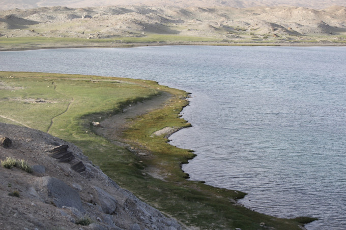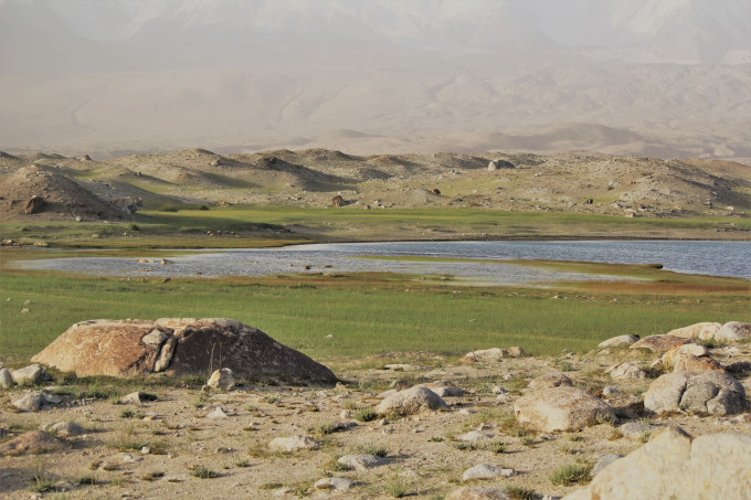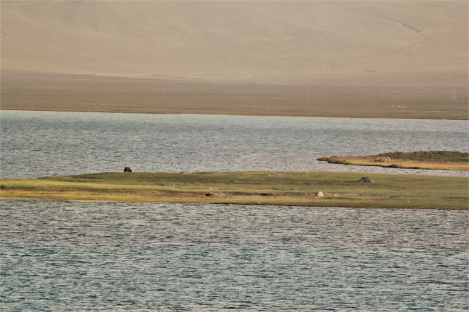 卡拉库里湖位于克孜勒苏柯尔克孜自治州阿克陶县布伦口乡。卡拉库里湖湖畔的苏巴什草原,居住着柯尔克孜牧民。牧民除了放牧外,也对游客经营餐饮和住宿营生。但这里牧民民风淳朴。我们提出要在湖边露营,牧民不但同意还热情带我们到适合露营的地点。不像赛里木湖,据说游客在湖边露营,当地人还去收费、骚扰。我们在离湖几米远的一块平地安营扎寨。安置好帐篷和桌椅板凳,然后沿湖观享湖光山色。