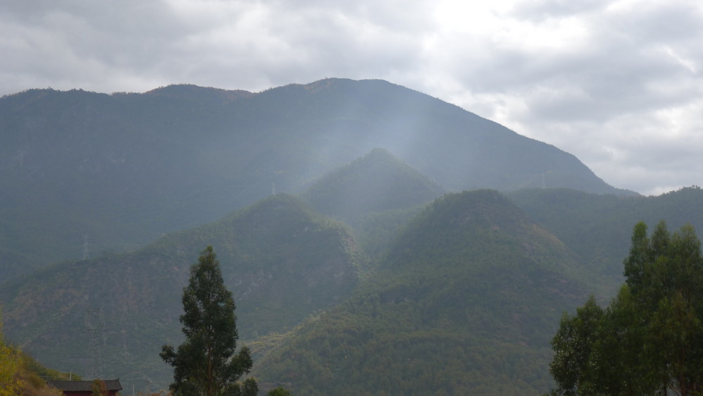 老天爷还是很照顾我们的,太阳基本一直躲在云的后面,从云缝里透射出来的阳光照在青山顶上,很美!