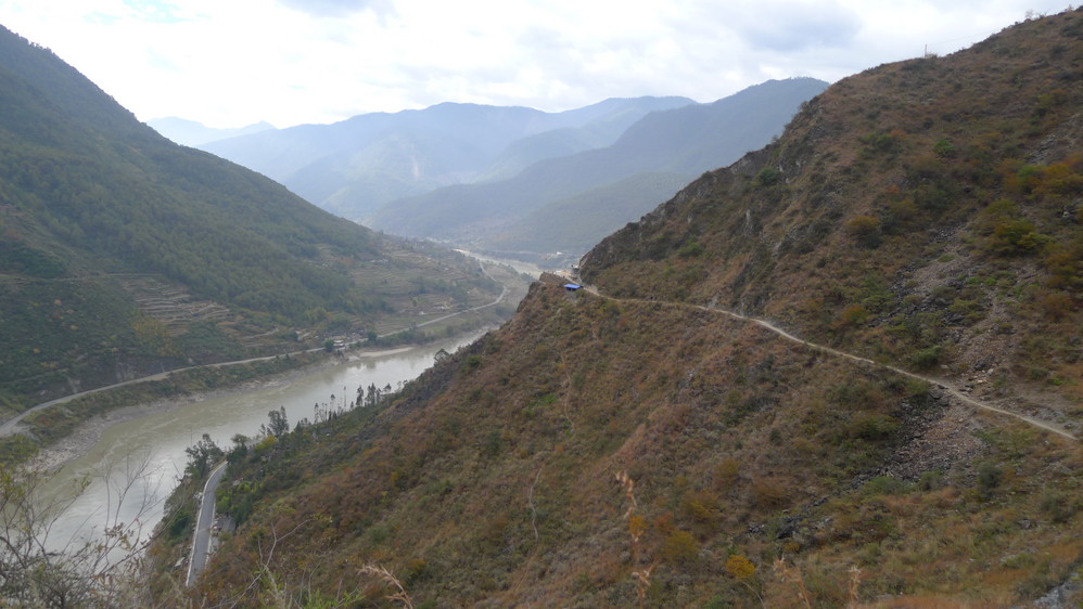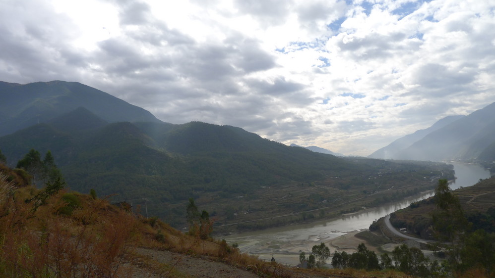从丽江 到桥头全程3个小时,一路都是盘山 路,司机开的很小心。中途有个免费的观景台,那里有个景点叫“长江第一湾”,其实也没有什么稀奇的,只是长江流经这里拐了一个大弯而已,接下来的行程这样的弯度并不少见。观景台里外摆满了卖特产的摊位。既然司机停下来了,我们几个中国 人还是上去拍了几张照片,老外似乎没什么兴趣,在车里没动。