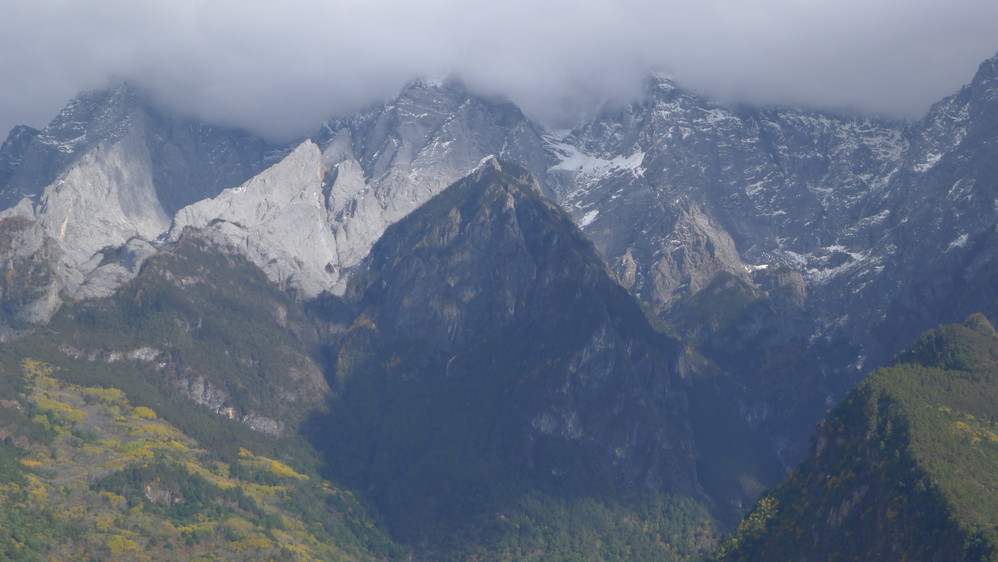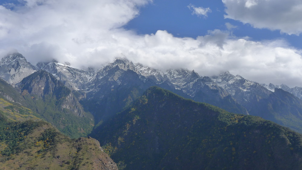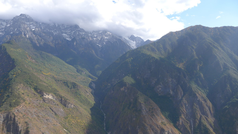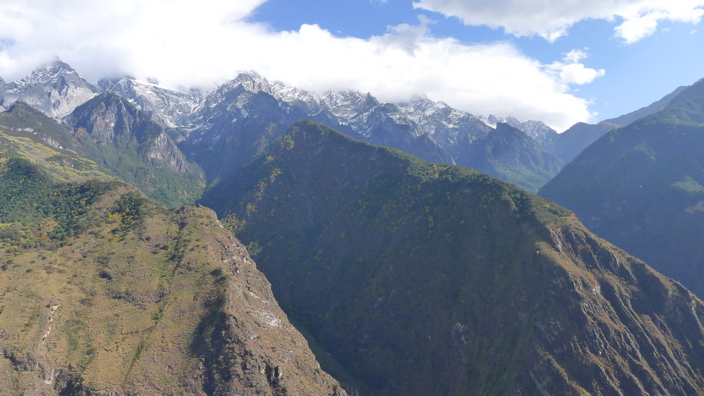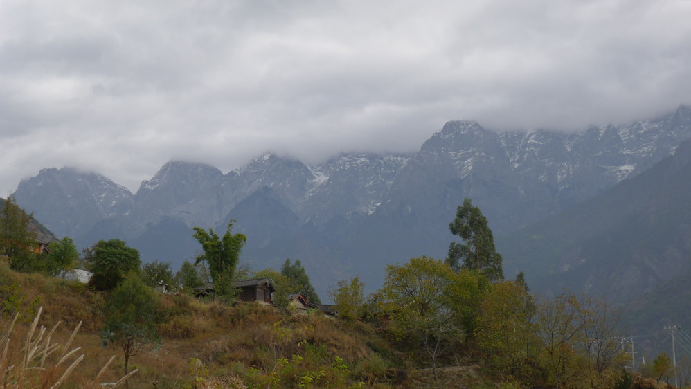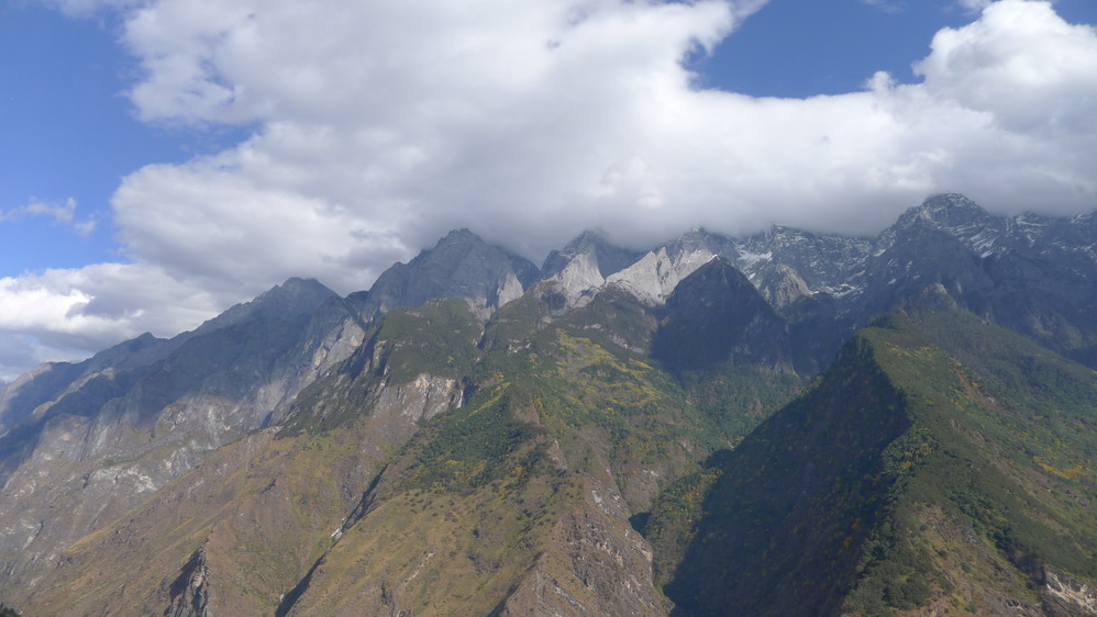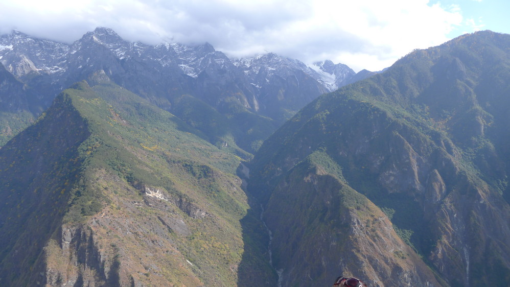 随着山路的延伸,感觉离玉龙雪山 越来越近,因为我们就走在悬崖边上,下面是奔腾远去的金沙江 ,对面就是玉龙雪山 !