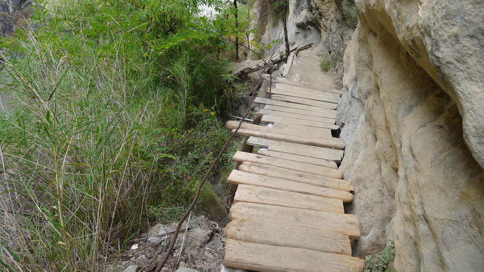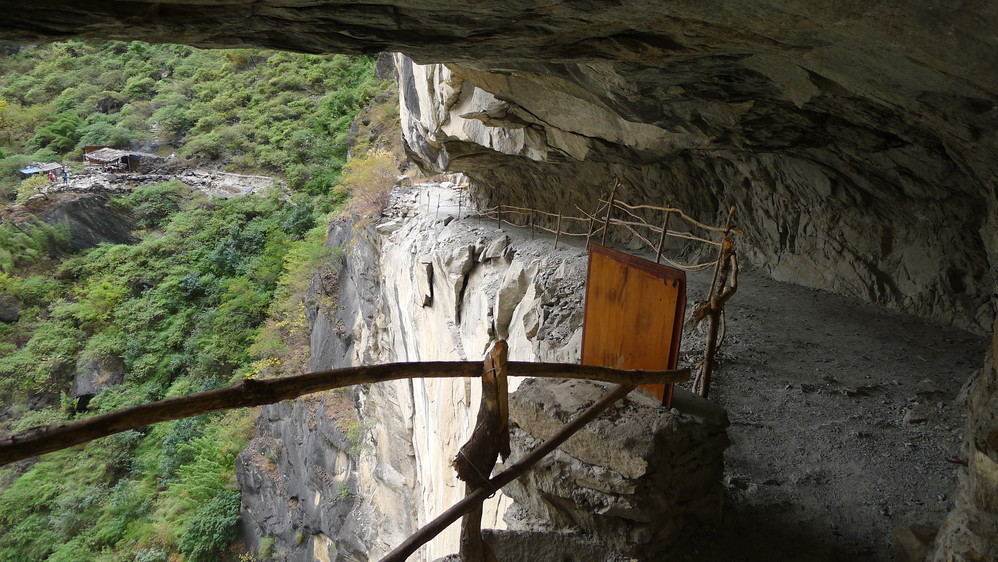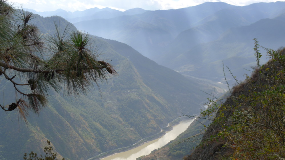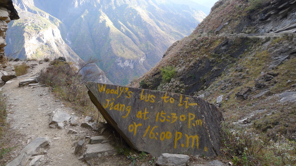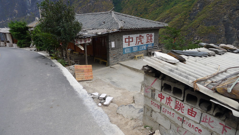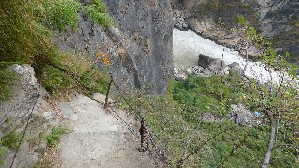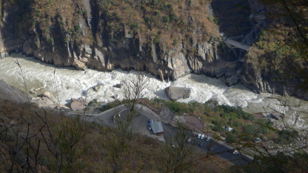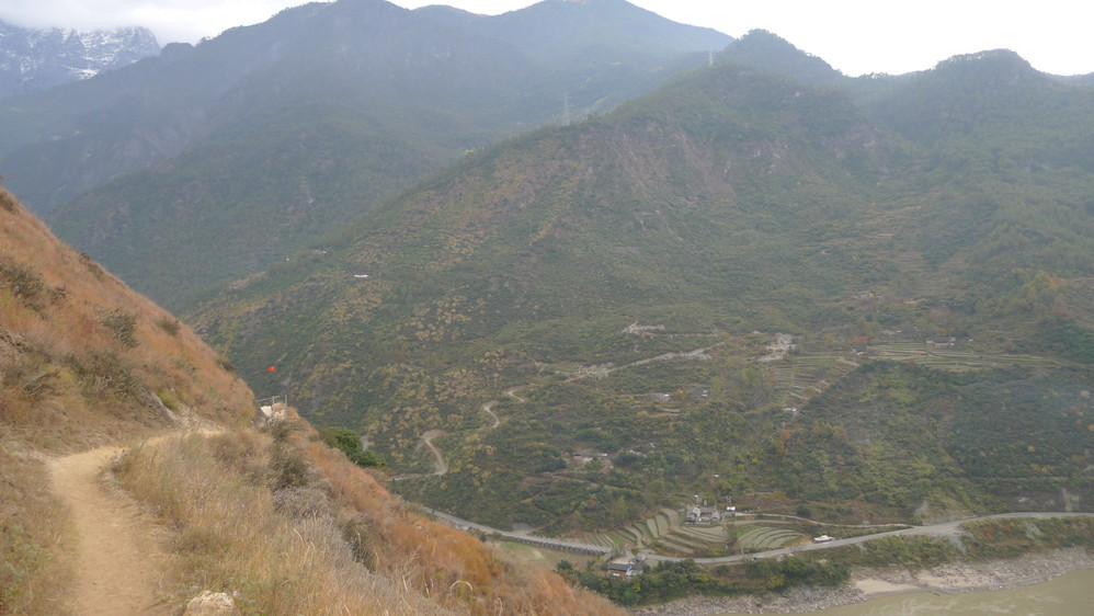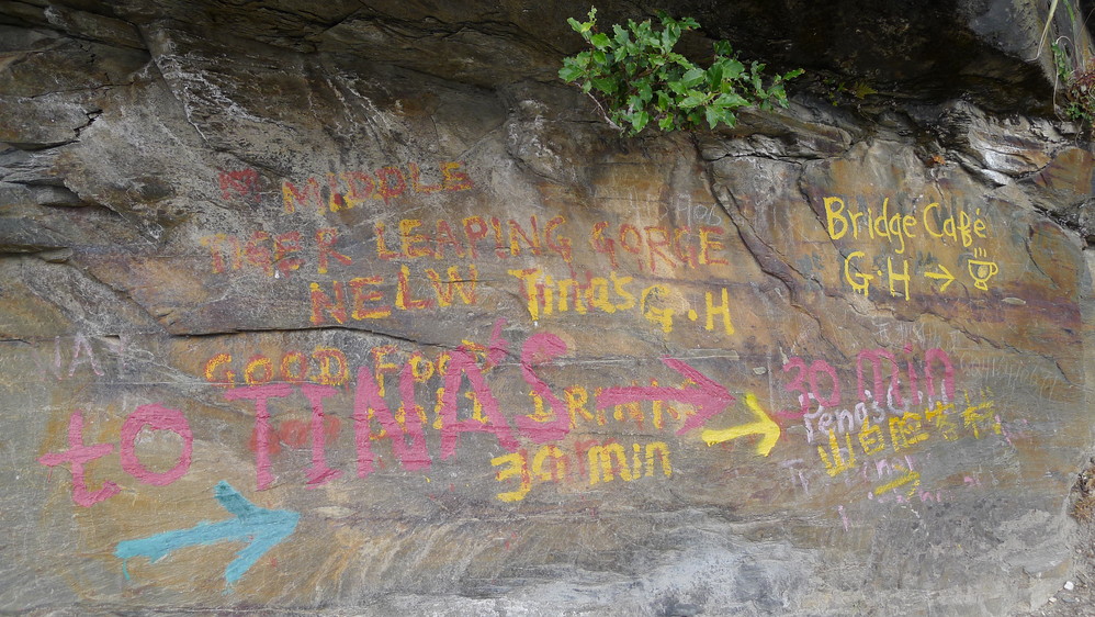 通往中虎跳有三条路,第一条就是著名的张老师家,因为在中峡青旅的另一侧,我来的路上错过了;第二条就是这家天梯客栈的入口处;还有一个是一线天入口,还要继续往下走。这时候收到短信,布丁他们已经到了天梯那里了。其实从天梯客栈这里下去是最近也似最方便的,不过当时我考虑从一线天那里进去还可以多看看谷底的景色,就继续往前走。
