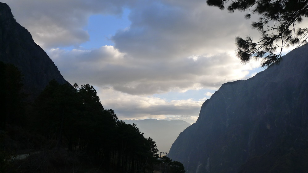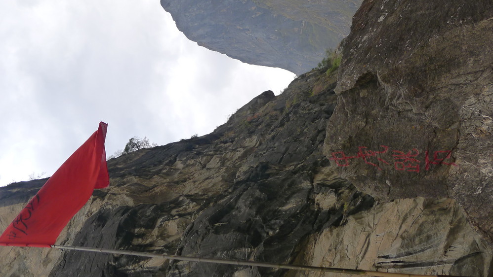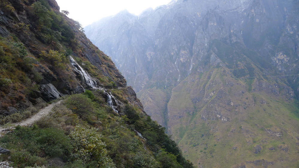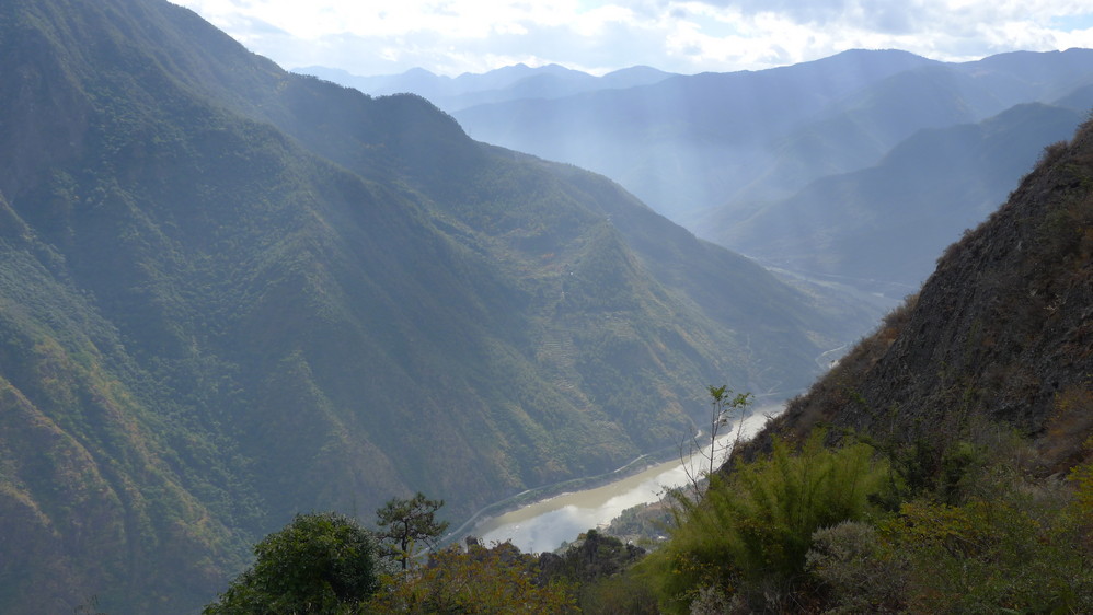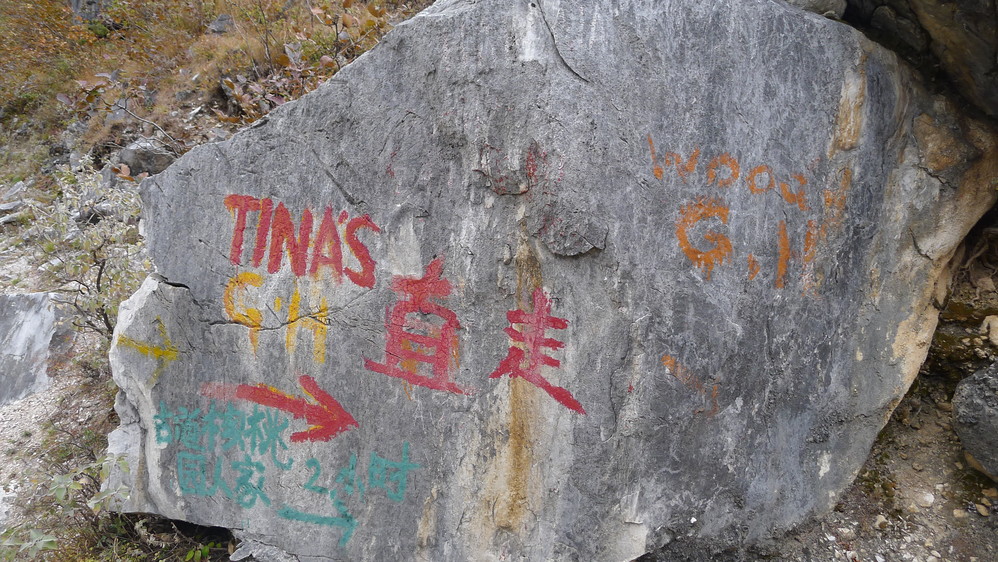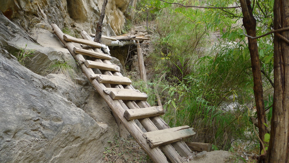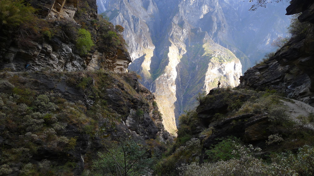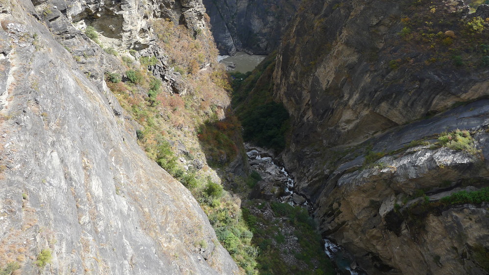 通往中虎跳有三条路,第一条就是著名的张老师家,因为在中峡青旅的另一侧,我来的路上错过了;第二条就是这家天梯客栈的入口处;还有一个是一线天入口,还要继续往下走。这时候收到短信,布丁他们已经到了天梯那里了。其实从天梯客栈这里下去是最近也似最方便的,不过当时我考虑从一线天那里进去还可以多看看谷底的景色,就继续往前走。