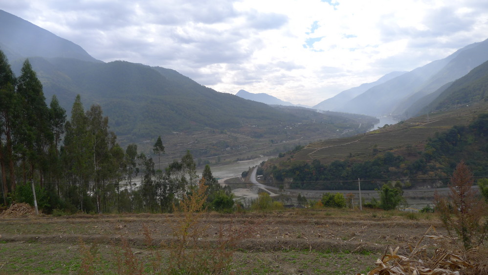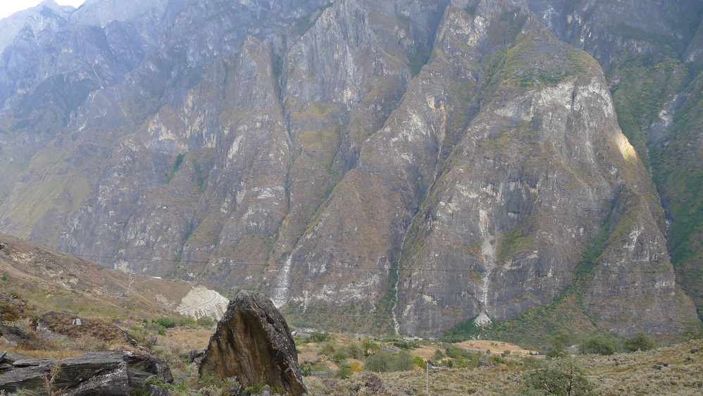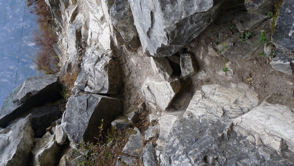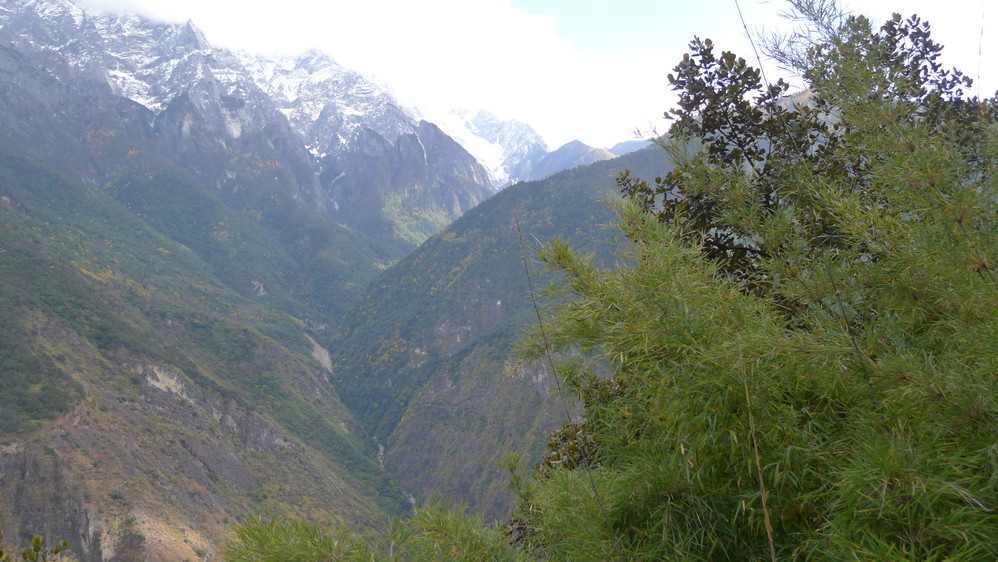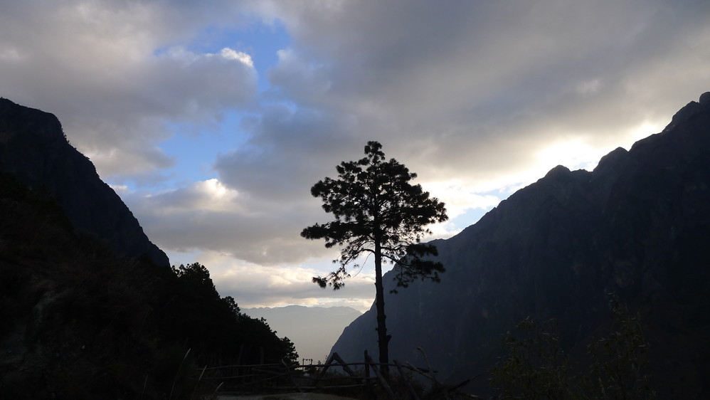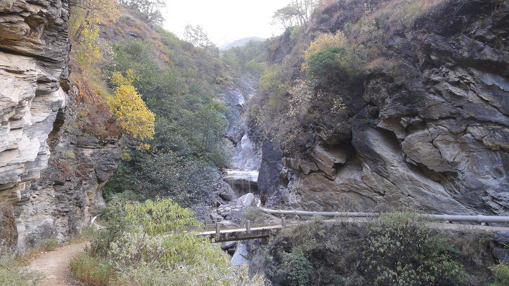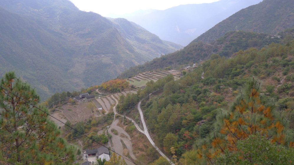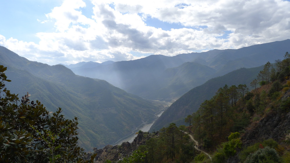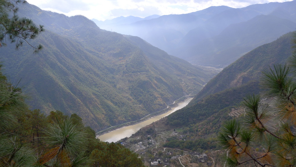 通往中虎跳有三条路,第一条就是著名的张老师家,因为在中峡青旅的另一侧,我来的路上错过了;第二条就是这家天梯客栈的入口处;还有一个是一线天入口,还要继续往下走。这时候收到短信,布丁他们已经到了天梯那里了。其实从天梯客栈这里下去是最近也似最方便的,不过当时我考虑从一线天那里进去还可以多看看谷底的景色,就继续往前走。