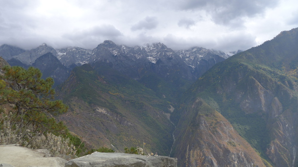 下面就是图中的一个拍照点,这里的位置好,下面是金沙江 ,对面是雪山山峰,正处于一个拐点的位置。一位老奶奶在这里守着,传说中的本地人,也是收费站。在这里拍照每人要交3元钱,当然也可以以同样的价格买一瓶水或者一个水果,注意,是一个水果哦!因为这里是他们自己开发的,我们5个人,除了茶垢外,每人买了一只香蕉。老奶奶还不依不饶的吵着让茶垢付费。心想这是何必呢?!